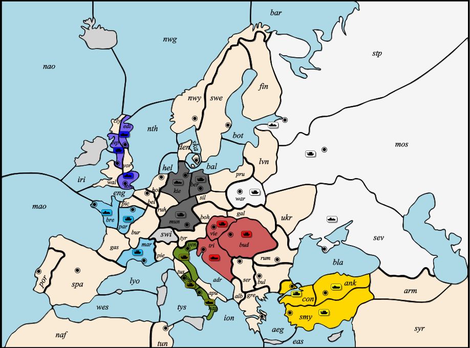 Diplomacy is an old board game, conceived in 1954 and commercially published in 1959, that acted as a rough simulation for studying the First World War. The game takes place in Europe, with seven players each controlling a major European power. It was also the first commercial game to be played extensively by mail. As such, it lends itself to play-by-forum-thread. I have a video game version, called jDip, instead of an actual board.