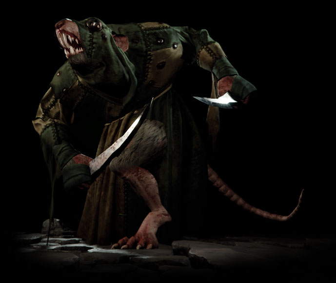 The weakest of Skaven. They are mere slaves that wield small weapons. It is very easy to kill them, even in swarms they are not too dangerous and are best cleaved through.