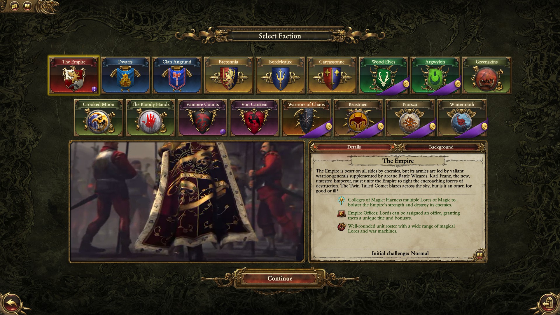Before the LP can begin, we’ll have to decide on our first faction to see! There are a ton of factions in Total War Warhammer 1, originally it launched with just 4 but we’ve seen DLC and FreeLC add more and more. I’ll give a brief overview of the factions to help you decide on who to vote for.