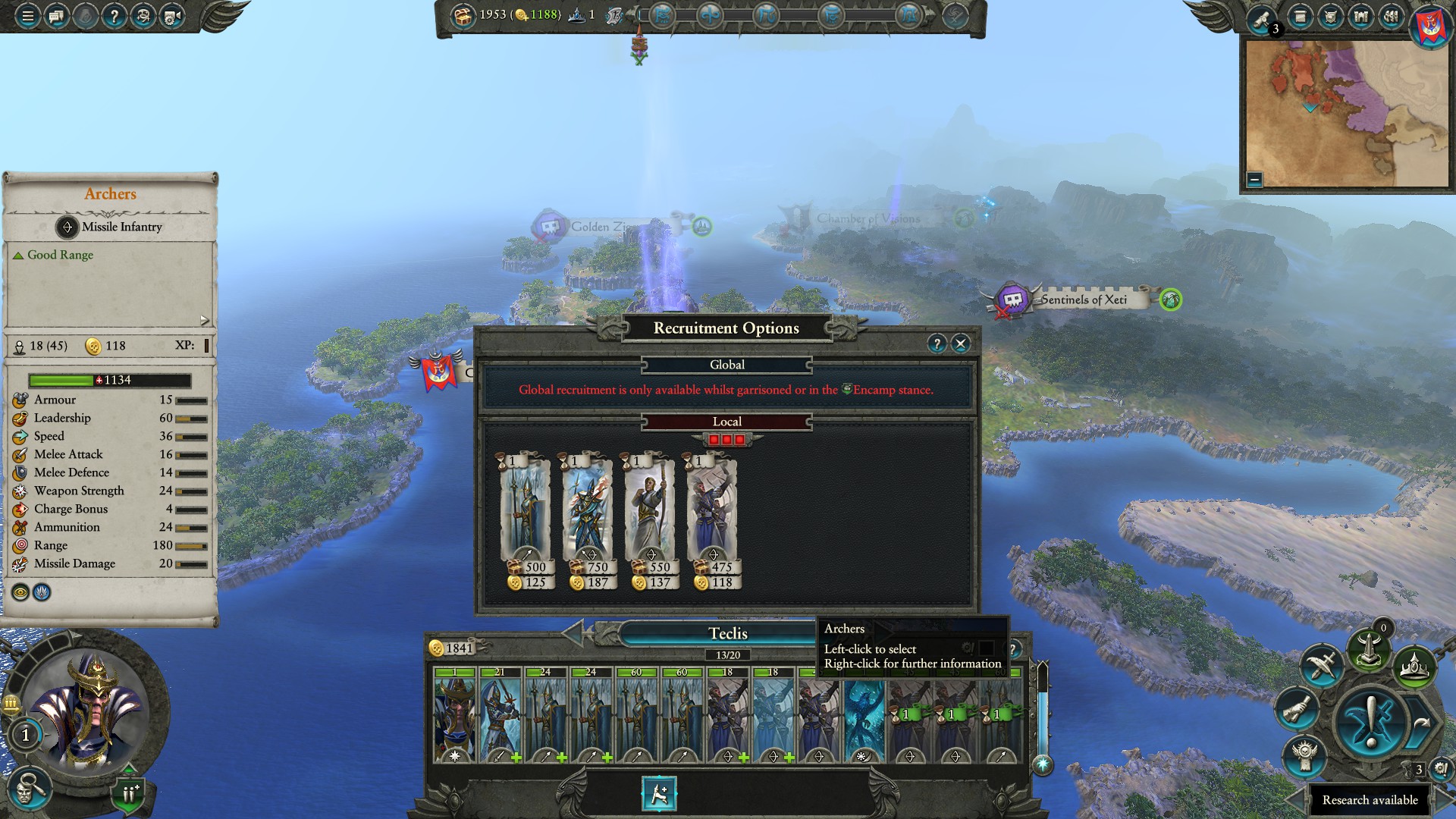 Led by the King of the Wild Hunt, Orion, the Wood Elves are able to expand to anywhere though they make small outposts rather than cities. They are defenders of the ancient fay woods. Wood Elves focus a lot on skirmishing and are not as well suited for up front battles. They have excellent ranged units and access to powerful monsters, though doing so is costly. A unique currency to them is amber which is used for purchasing units that are elite.