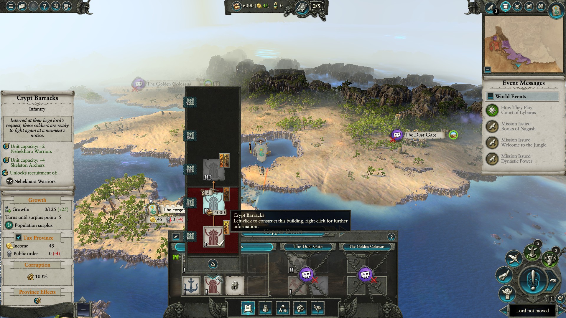 We construct a Crypt Barracks which will be done in 3 turns. The Tomb Kings make little gold each turn. Because of this it is difficult to construct buildings in settlements often. This is a constant problem one will face when playing as the Tomb Kings. The Crypt Barracks allow for Nehekhara Warriors. They’ll be a bit stronger of a front-line portion for Khalida’s army.