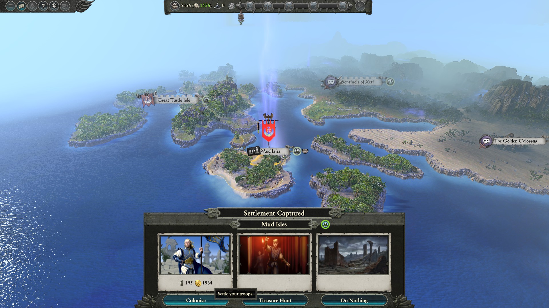 To the South we’ll be taking the Mud Isles as Teclis. When approaching ruins you can choose to do nothing, Colonize, or do a Treasure Hunt. Treasure Hunt is something we’ll see later on. For now though after paying for colonizing we’ll want to build up the settlement. It starts out at tier 0 and needs to be upgraded to start having any buildings or for it to make any money.