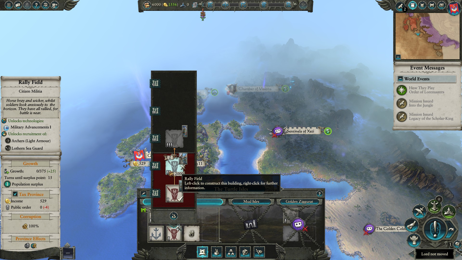Building a Rally Field is easy enough. It only takes a couple of turns. The cost is 2000 gold, at this point Teclis is earning 1556 gold per turn. Settlements have 5 levels to them, with small settlements capped at tier 3 and main settlements for each province are capped at tier 5. Tiers determine how many buildings you can have in a settlement and what level they can be. As such if a building caps at level 3 or below you want it in a minor settlement and if it caps at 4 or 5 you want that building in the main settlement.