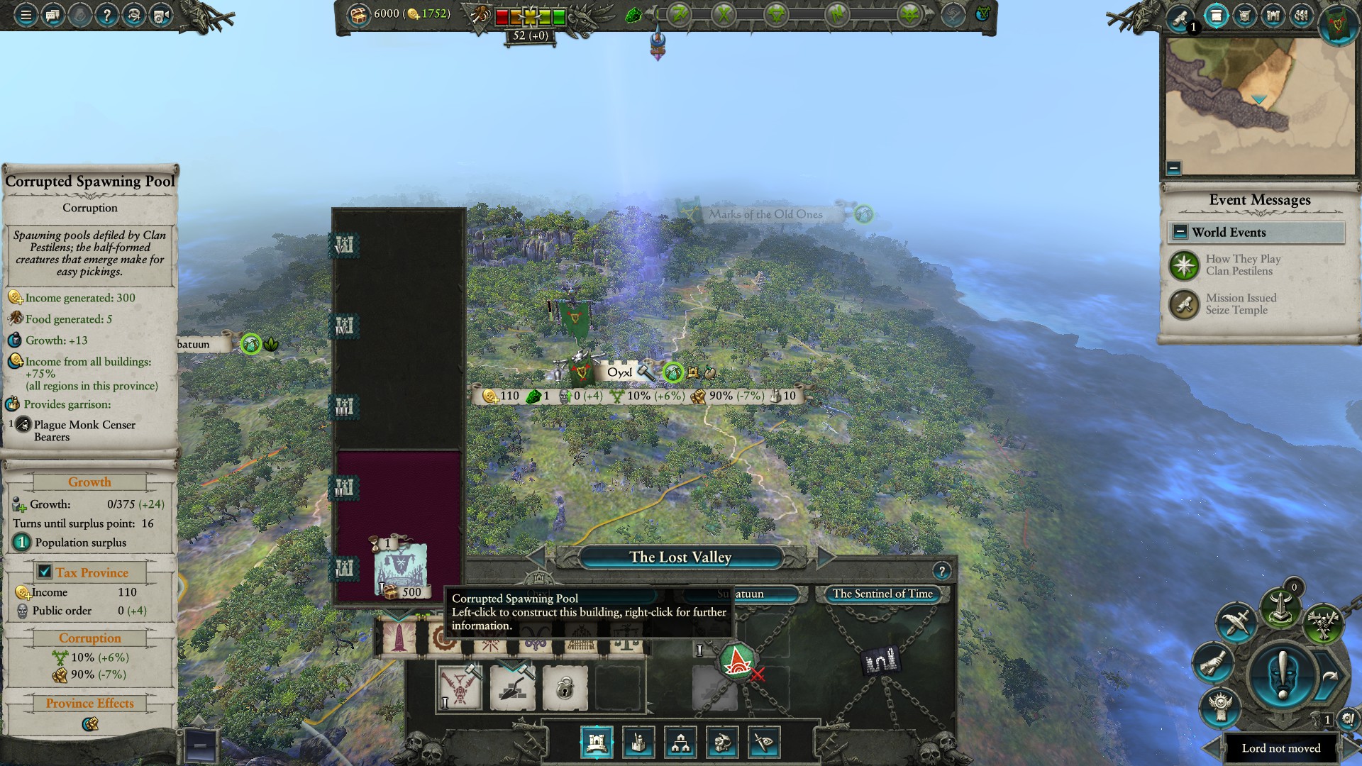 Sometimes settlements have special buildings that can be built only at that location. The Corrupted Spawning Pool is one such that Clan Pestilens has access to at Oyxl in the Lost Valley province. With it Oyxl will gain a garrison of Plague Monks, powerful melee infantry of the Skaven. With them there protecting the settlement, we are able to move further South safely.