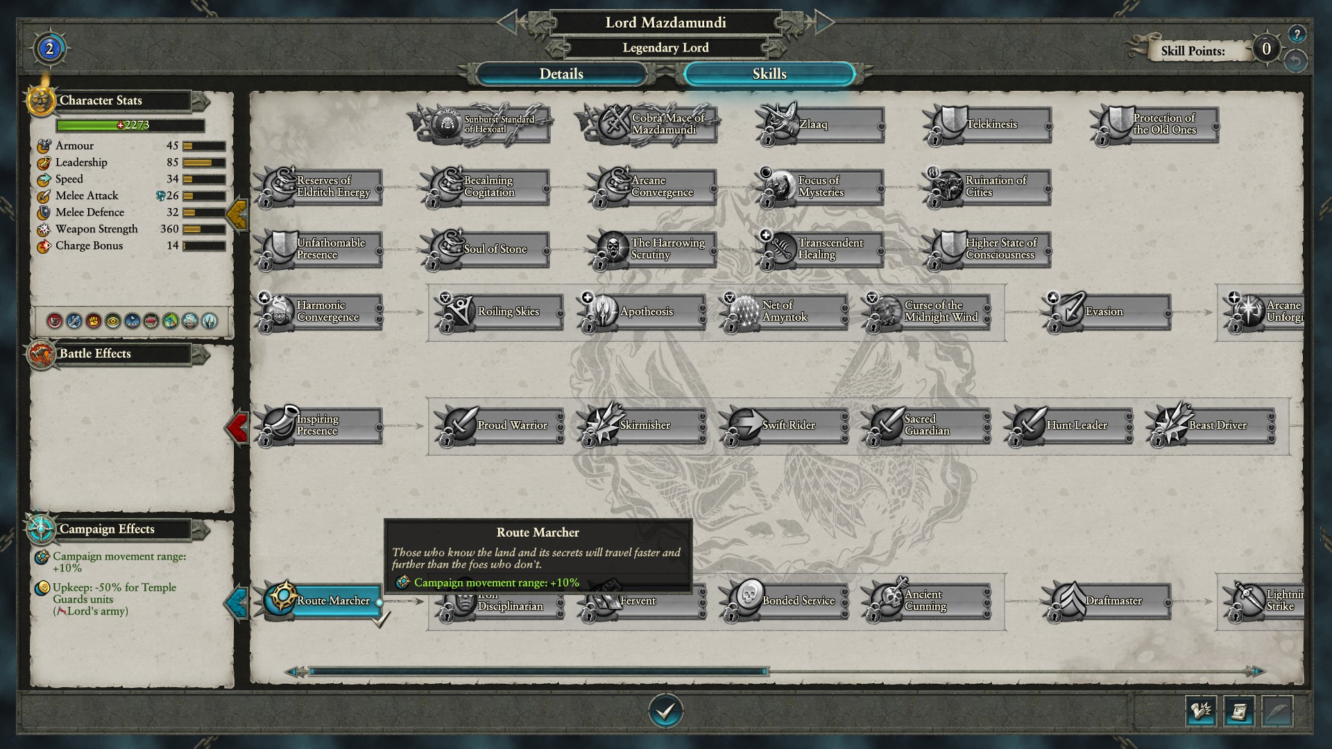 Lord Mazdamundi has leveled up. When a Hero or Lord levels up you’re able to choose skills and abilities from them. In general there are three main trees that depend on whether a character is a fighter or mage. Magic/Combat, Army(Battle), Army(Campaign). We’ll be taking Route Marcher which is an excellent choice. It gives more campaign movement and allows you to more easily control a region and allows you to do more in less turns. In the future though we’ll be working on Mazdamundi’s magic.