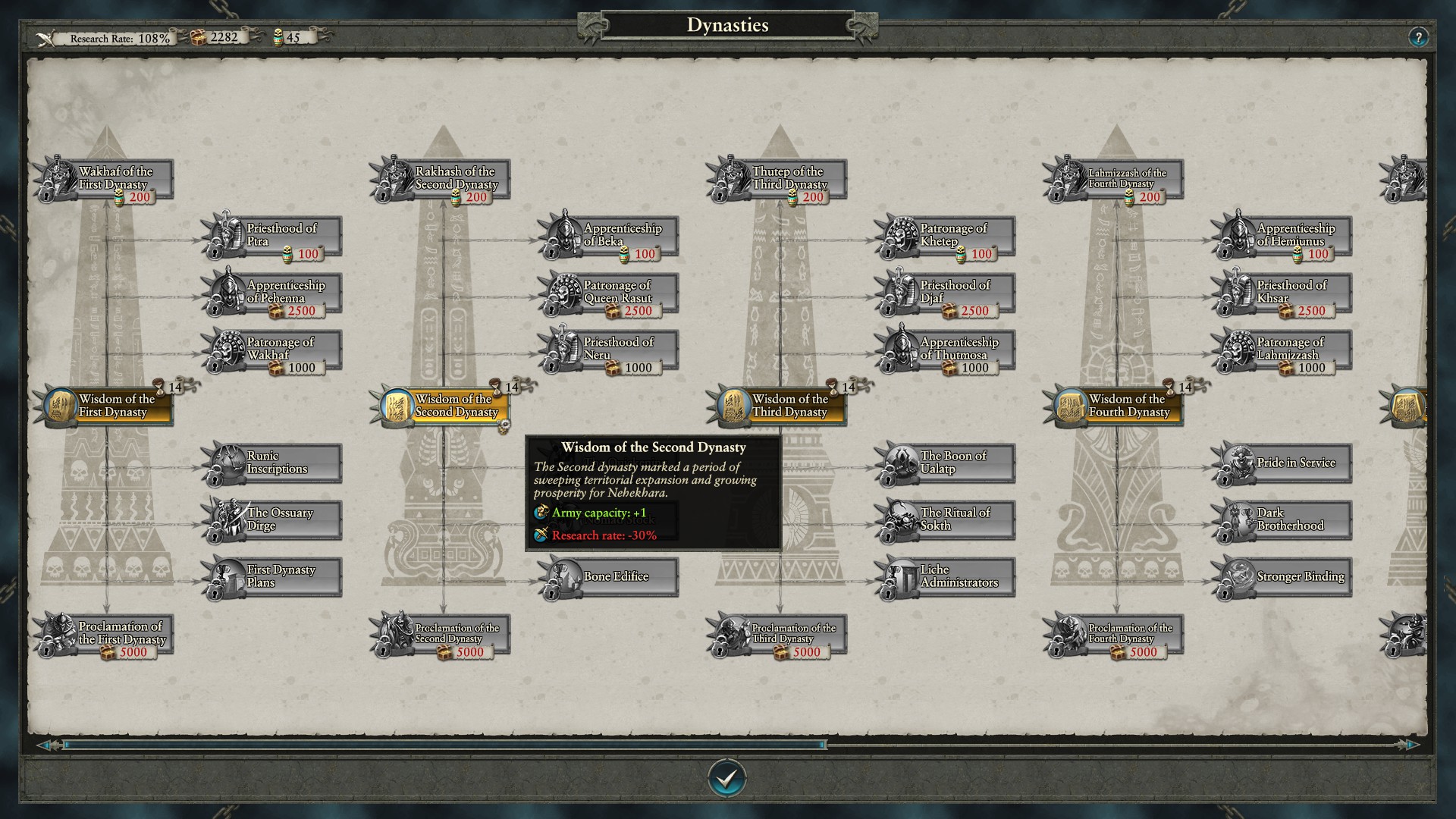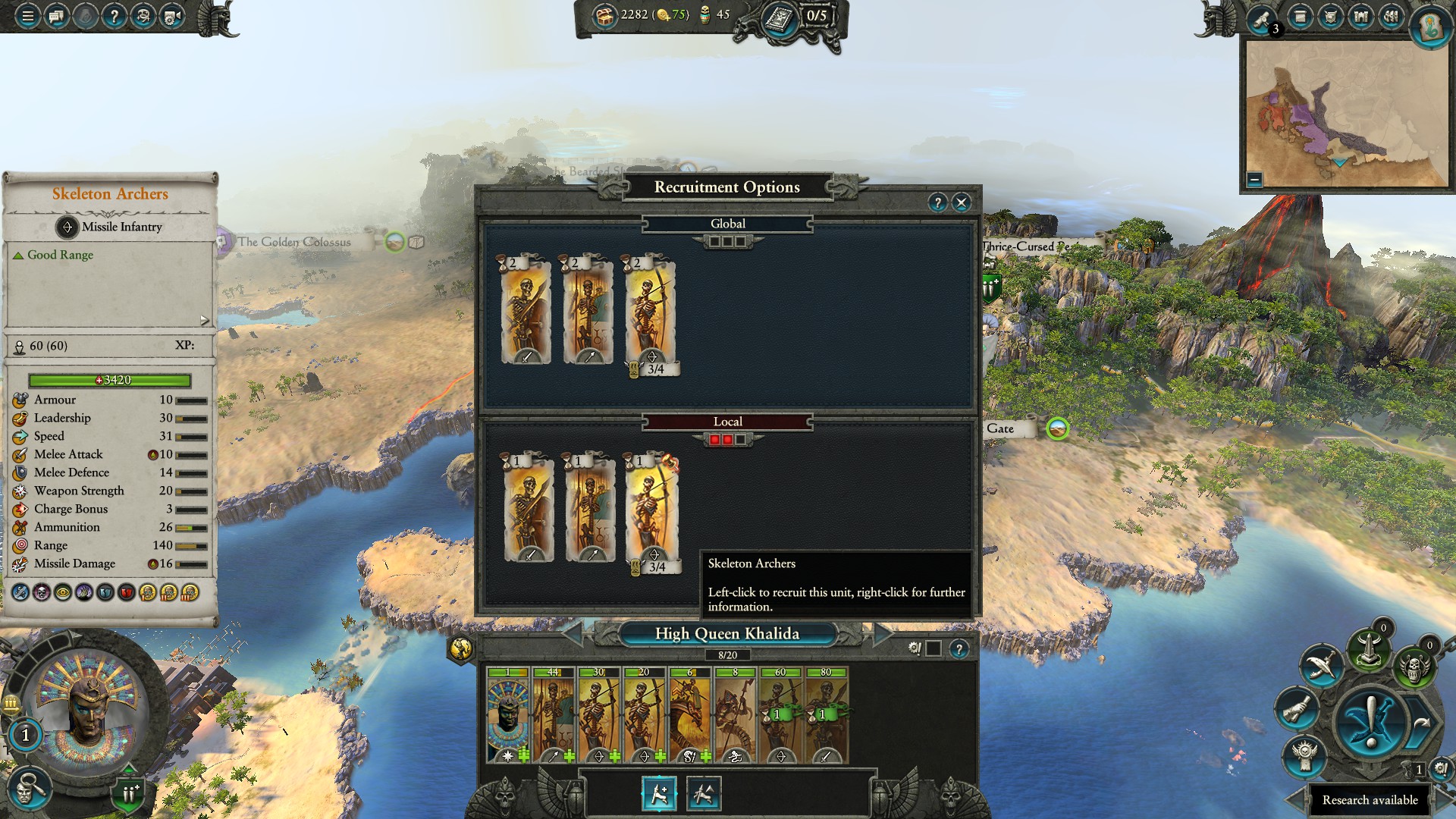 We’ve reached the point where it is time to research Technologies. Tech is highly important and will give boons to your armies, both in and out of battle. For the Tomb Kings each dynasty you research as well increases how long it takes to research techs but also allows you to host another army. Because of this tech is far more important for them than any other faction They dynasty we’ll be choosing gives bonuses to archers which will be very helpful in the future. Queen Khalida gets a bonus to the ammunition amount for her missile units which we’ll be taking advantage of.