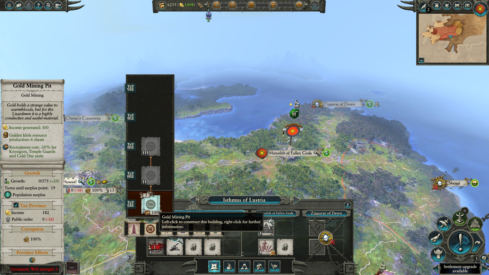 In Hexoatl there is cause to upgrade the settlement to the next tier. With that in mind using a natural resource, gold, we are able to build a Gold Mine. These structures are boons for their owner that heavily increase supplies of gold making it easier to recruit more units and build more.