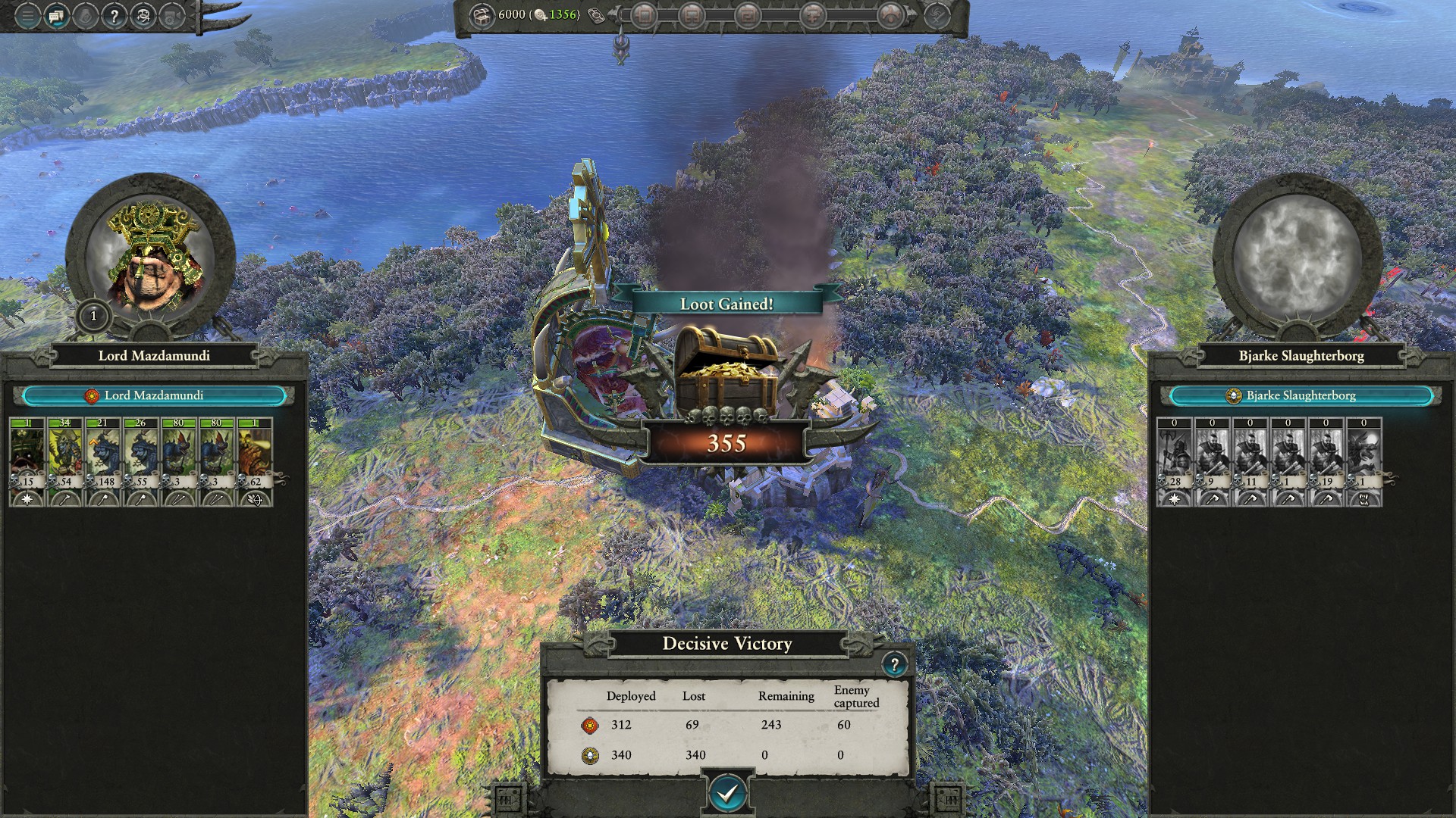 Skeggi have overtaken the nearby lands. These Norscans who follow the gods of Chaos are a taint upon the jungles of Lustria. With his Temple Guards Lord Mazdamundi is able to retake the Monolith of the Fallen Gods. After each battle the victor receives loot which is based upon the cost of the loser’s units/structures. Mazdamundi chooses to Occupy the city without looting leaving it in pristine shape. He wastes no time and begins to recruit Skinks to his army.