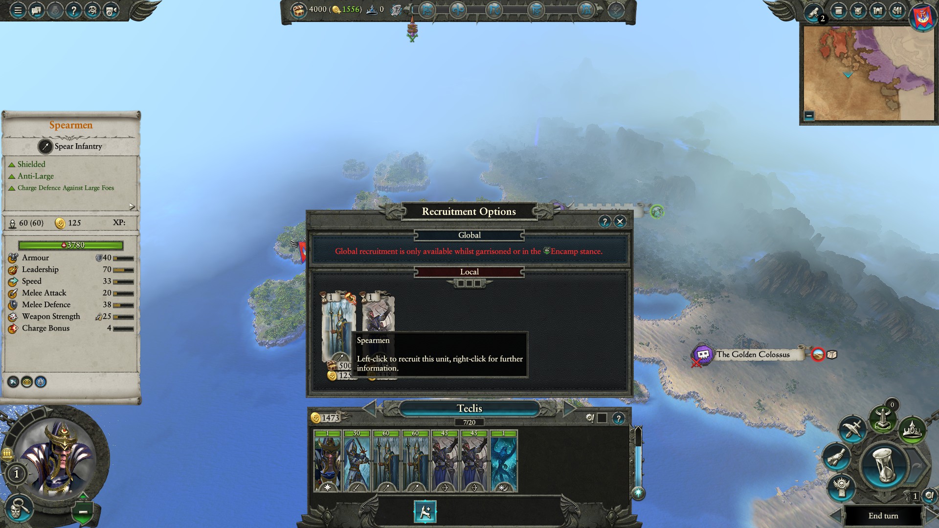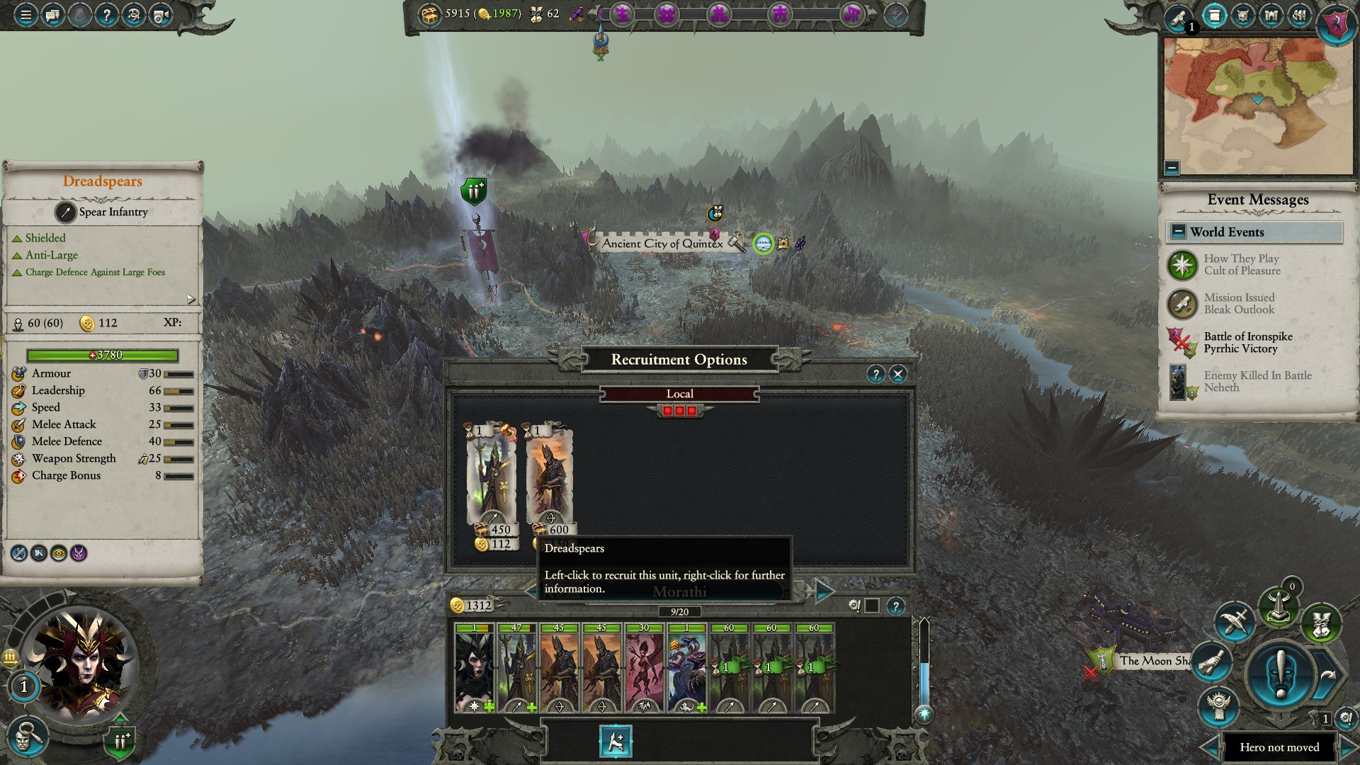 During the battle Morathi lost a group of Dreadspears, yes they’re actually called that. To regain the losses we’re going to recruit more after moving back into our own territory. Dreadspears cost 450 gold to recruit and have 112 upkeep.