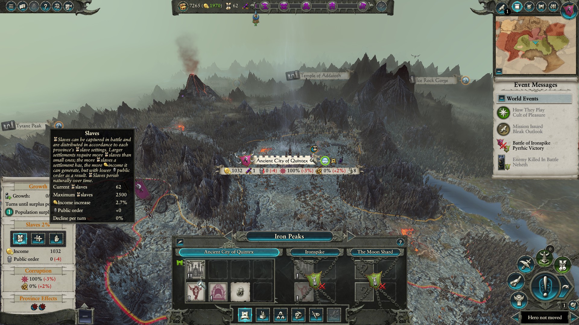 Slavery is a system only for the Dark Elves. They may take slaves and use them for economic purposes or rituals. Having slaves increases the amount of money a settlement produces but also causes Public Order problems. Public Order determines whether you will have a Rebellion or not. When Public Order in a province reaches -100 they have a Rebellion, an army will spawn that will then attack the province. They can be farmed but are dangerous and will require management of multiple armies to be both aggressive while defending against them.