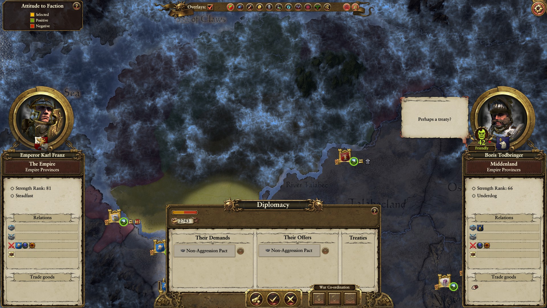 Boris Todbringer wants a Non-Aggression Pact. With it in effect we agree to not be aggressive towards one another. That way we can put our focuses elsewhere knowing we won’t be a threat to one another. The Reikland is surrounded by friends and foes and in the future diplomacy will be highly important.
