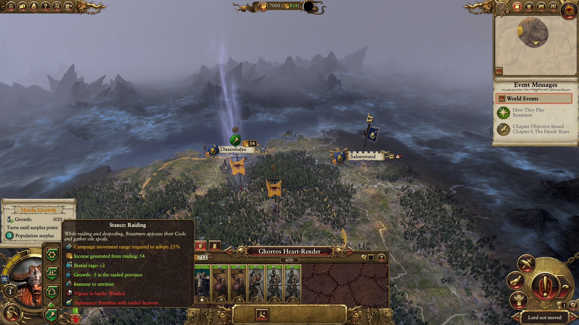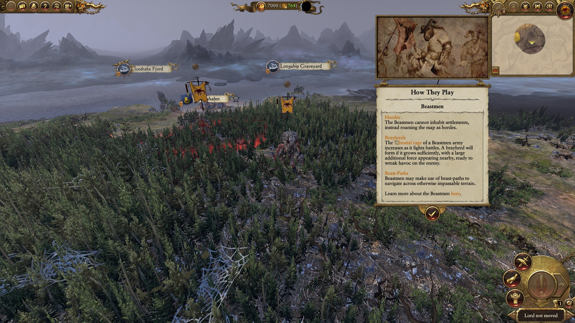 Beastmen have a few odd stances. They’re able to ambush nearly all the time and can raid. Their best stance is using the Beastpaths. These secret paths allow Beastment to easily traverse natural landmarks and hazards that would stop other armies.