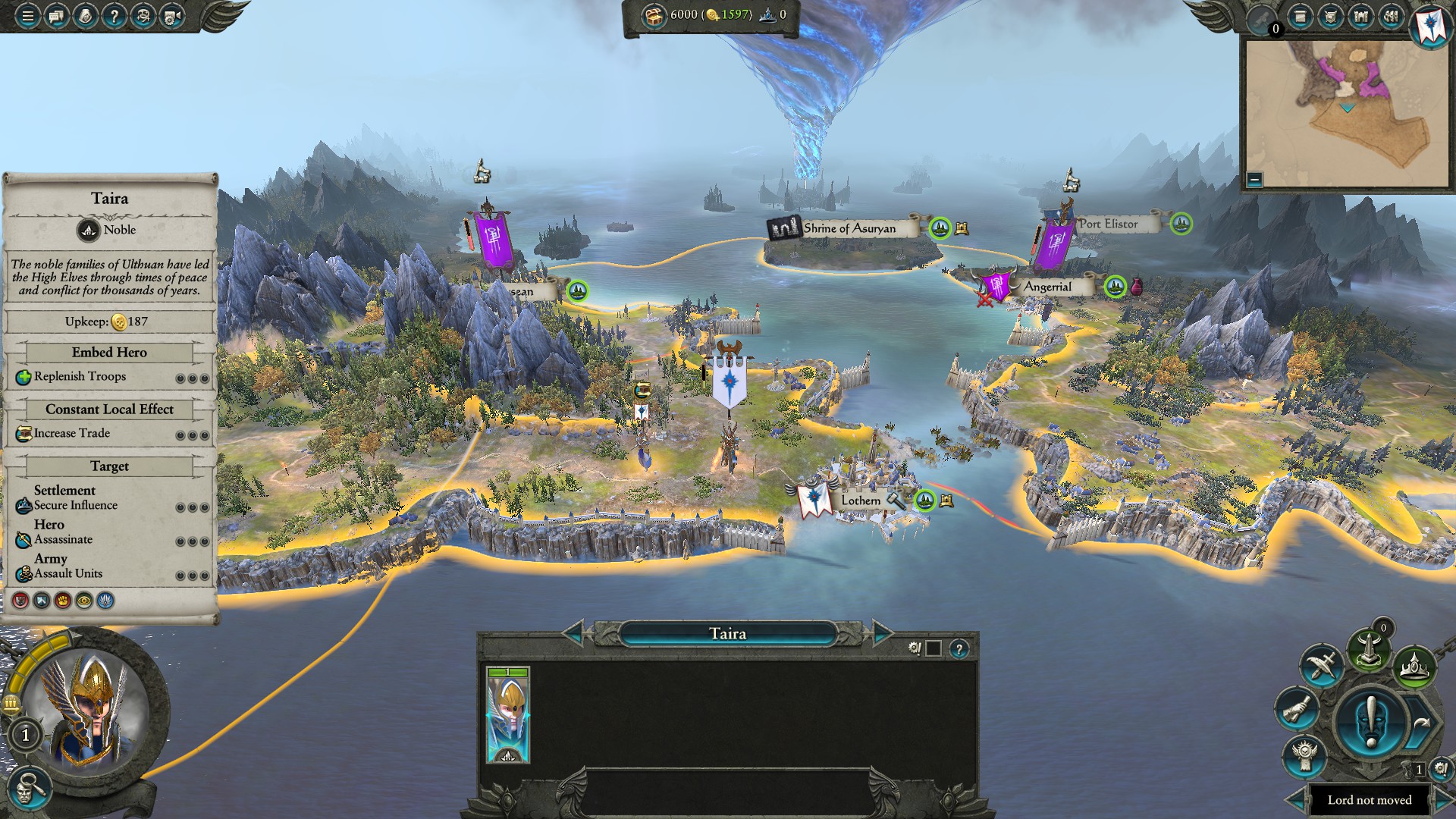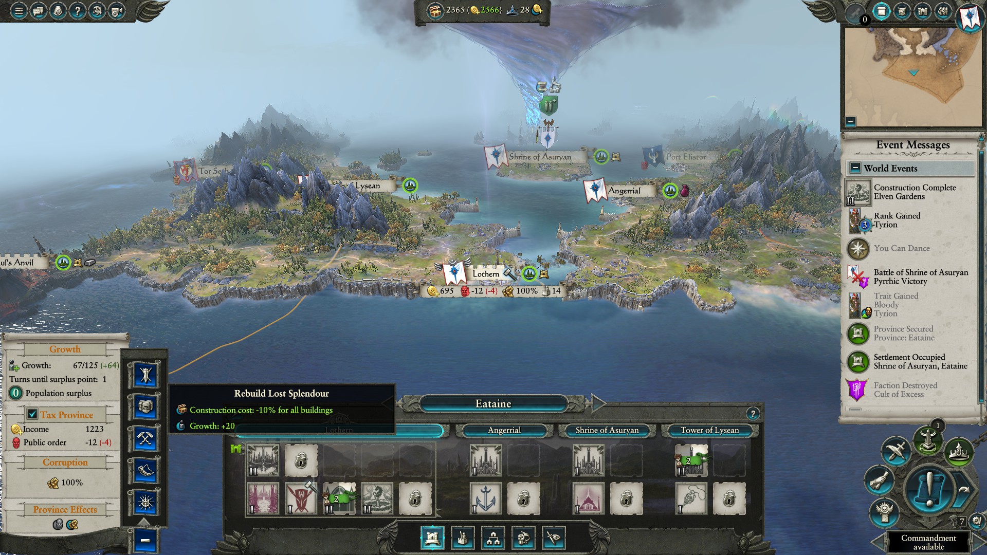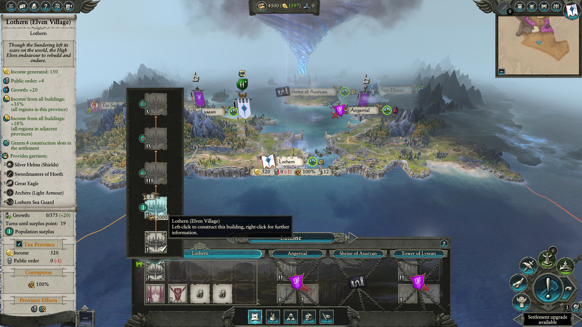 We begin with the capital of Ulthuan, the home of the High Elves. It begins with a special port that increases growth and gold production a good deal. First we’ll upgrade the settlement and get to work recruiting. While the early game in Vortex campaign is a bit easier for Tyrion in Mortal Empires you start out quite surrounded.