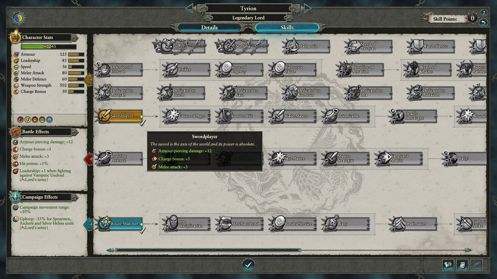 For Karl we’ll be leveling him up mainly as a leader foremost, focusing on his army. With Route Marcher and the upkeep for his troops lowered, Karl Franz can more easily host elite infantry. As we focus on his army we’ll be building him up to make his infantry much better.