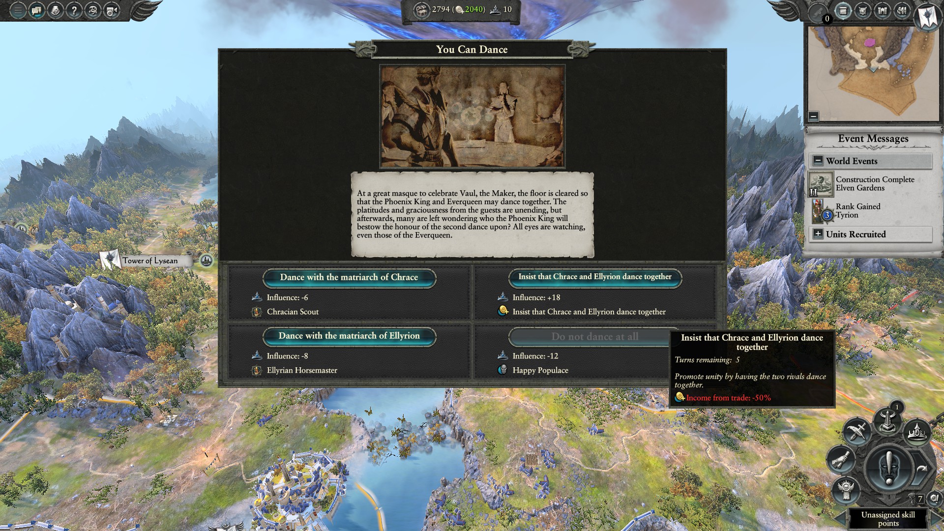 Ah the Life in the Lagoon. Our prince gets to decide on suitors for the Phoenix King and how they should be treated. We lack the Influence to allow for a happy populace, and are in need of Influence for diplomatic reasons. Influence can be used to, well, influence. When you are using it you can cause factions to have negative or positive reactions towards you or other factions. As well Heroes and Lords that do not have seriously bad flaws require influence to recruit.
