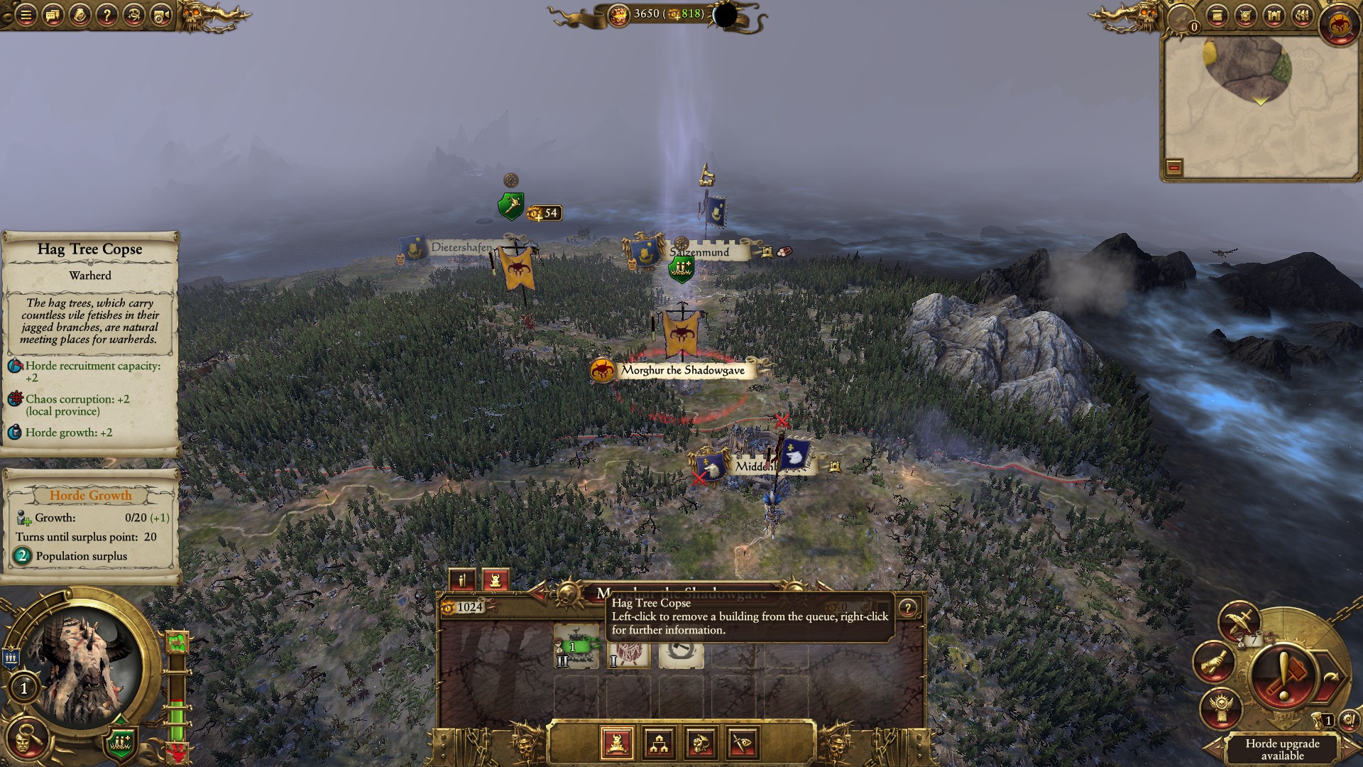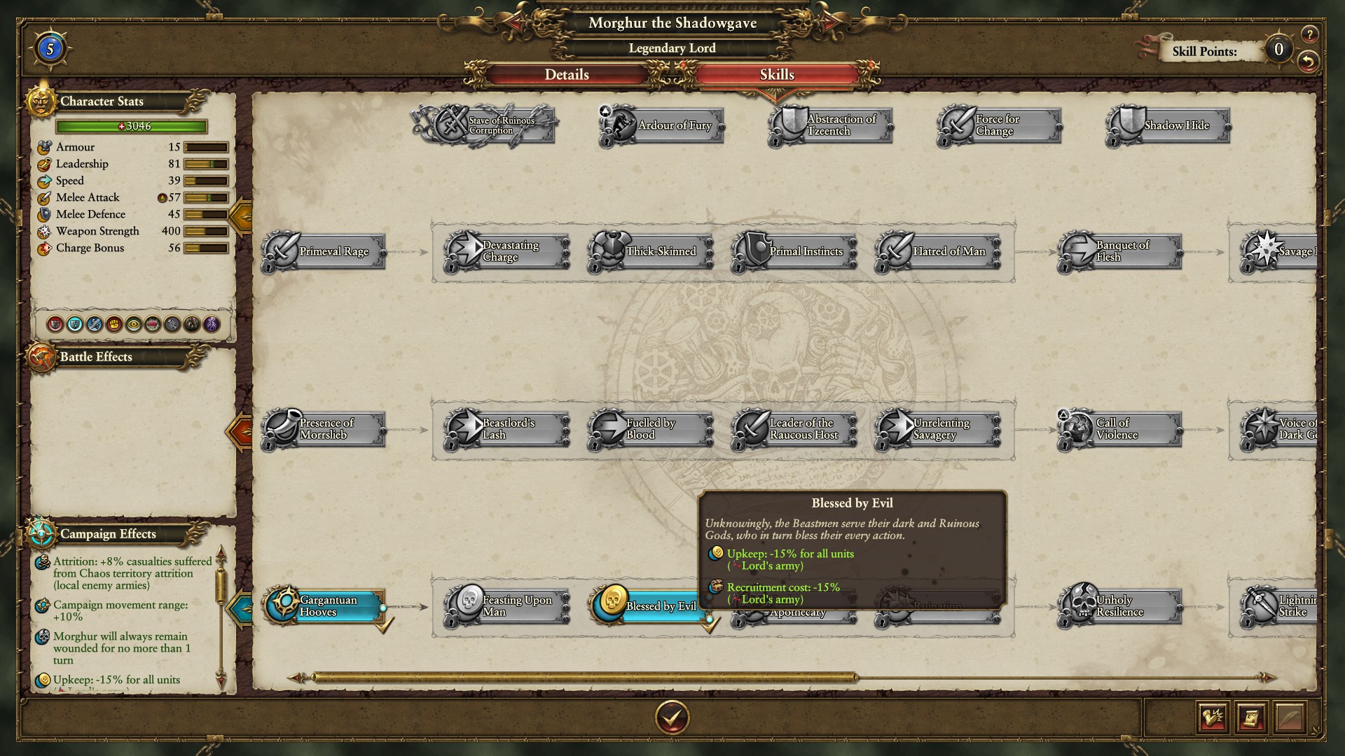 Morghur is strong enough in battle to hold, what we want instead is for him to have campaign benefits. I find them more useful when playing as Horde factions, allowing you to not worry as much about gold and to get the useful skill Lightning Strike. I’ll go into what that is later.