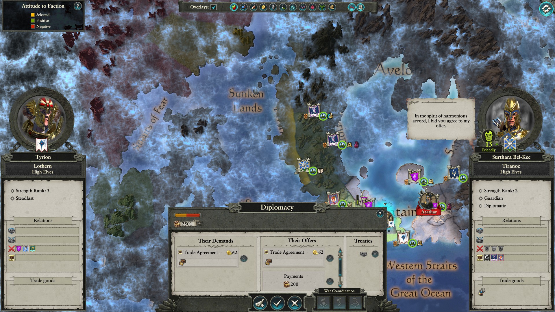 Oh would you look at that, someone wants to chat. They wish to have a trade agreement. The AI or you can initiate diplomacy with effectively anyone but sworn enemies. When engaging in diplomacy you can decide on exchanges of gold, influence, set up alliances, declare war, and in this instance make Trade. Trade requires you to have a physical path to another faction. This is much easier when there is a sea port. You have the ability to exchange resources that are based upon settlements that have them. This creates revenue for both factions involved, so trade is a net bonus.