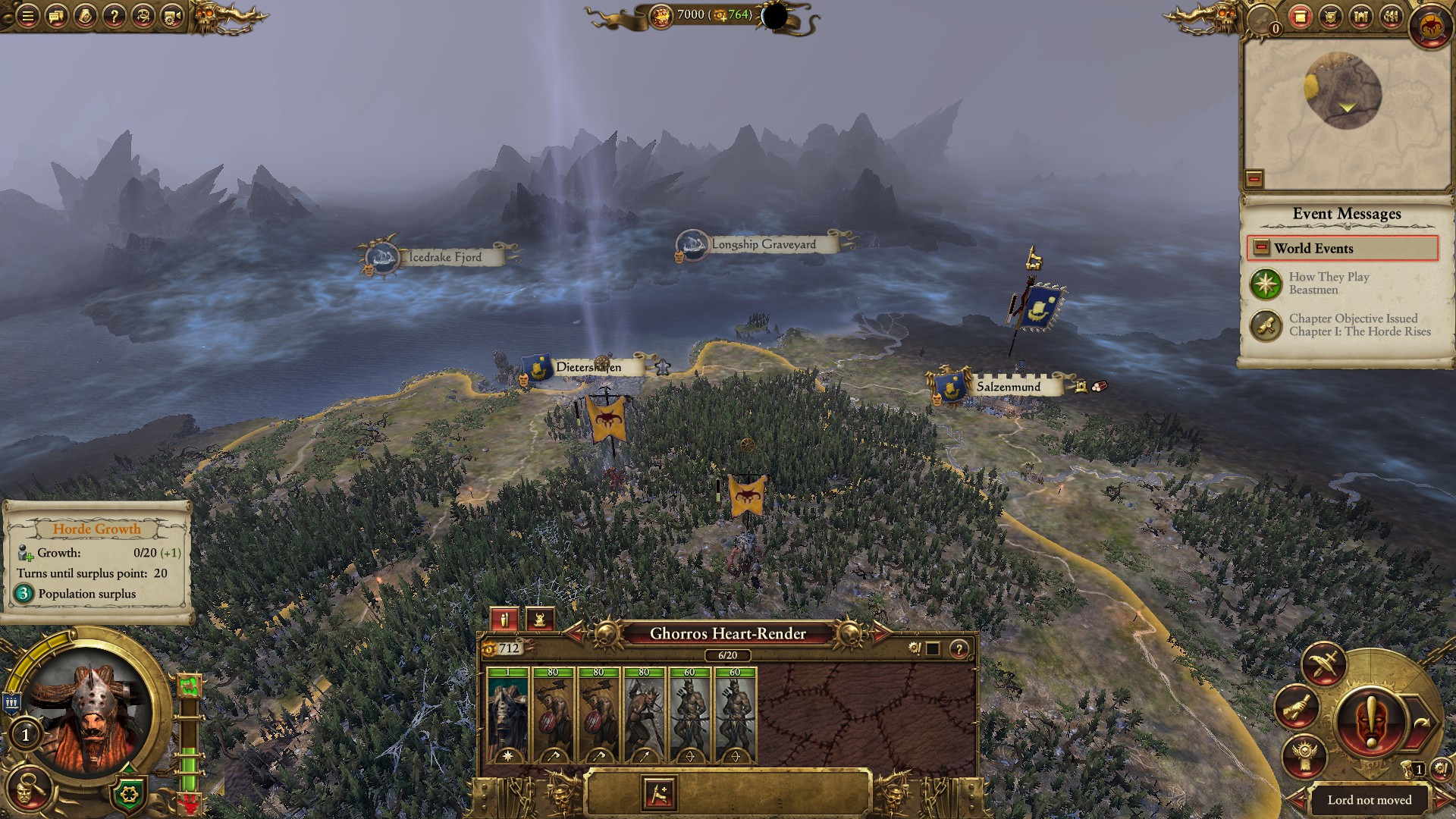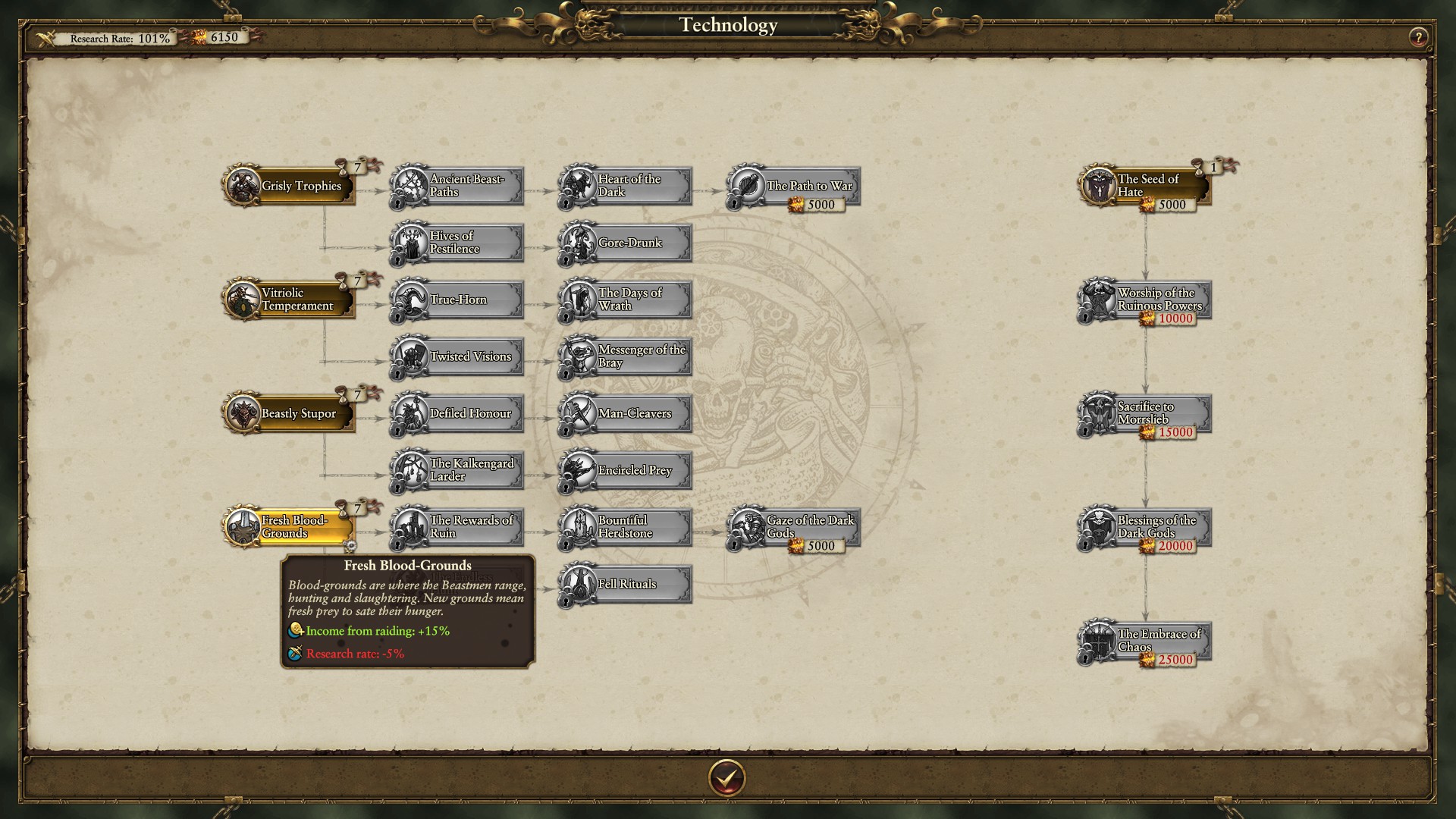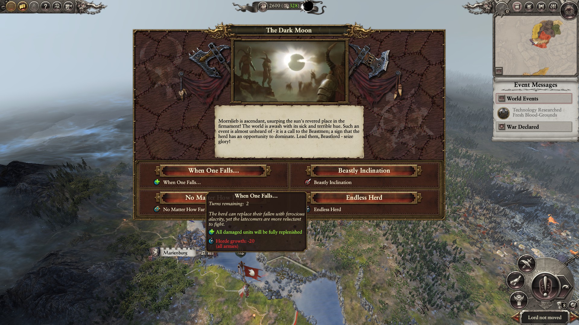 Our main army is weakened. At times Beastmen get special events based upon phases of the moon. We’ll be taking instant Replenishment to allow us to continue our battles without fear of Karl Franz coming and destroying us.