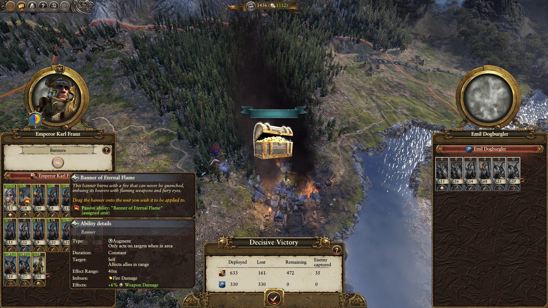 In battle against the Secessionists we have gained a banner. Banners can be placed on a single unit to improve how they do in battle. This banner makes said unit deal fire damage, highly useful against the Vampire Counts and Tomb Kings as well as Tree units which are weak to fire.