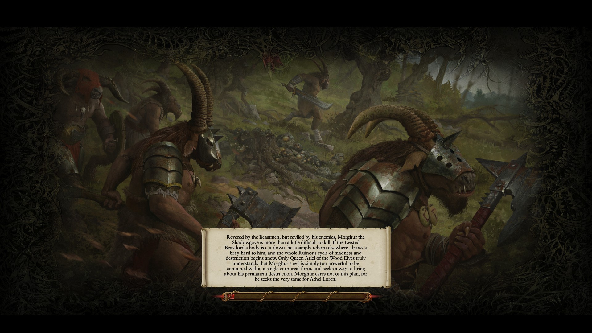 Possibly the greatest and most wicked of the Beastlords, Morghur is the Shadowgave, the Master of Skulls, an ancient creature of unspeakable evil. This immortal being is a taint upon the lands, drawing in the touch of Chaos wherever he goes. Morghur is favored by the Gods of Chaos. He leads his horde in an unending march through the lands to defile the Empire of Man and return them to a primal chaotic existence, one akin to the Beastmen.