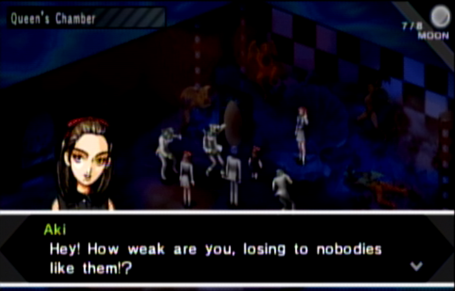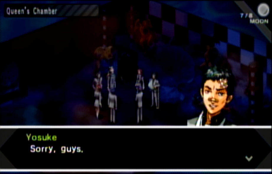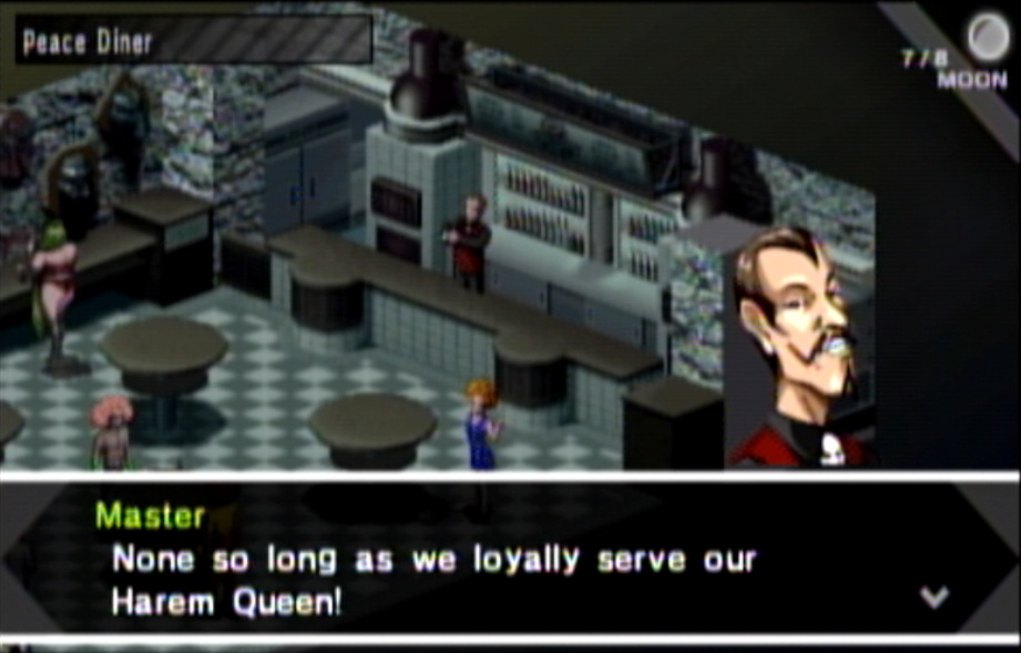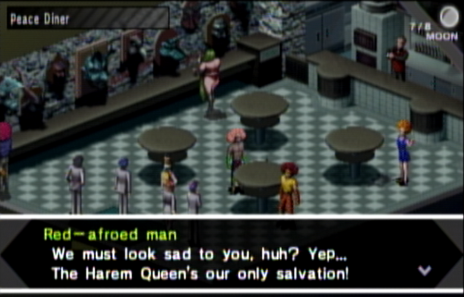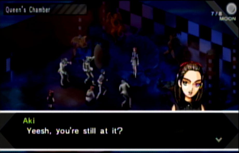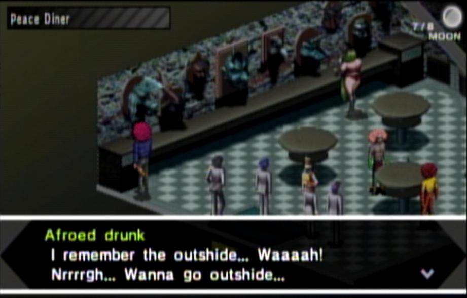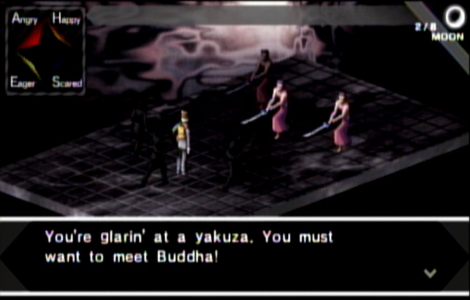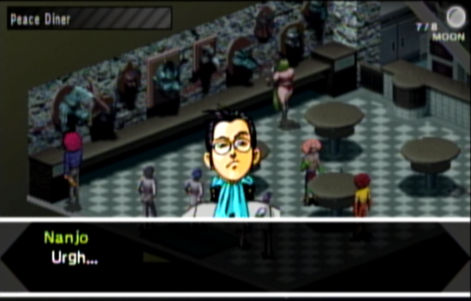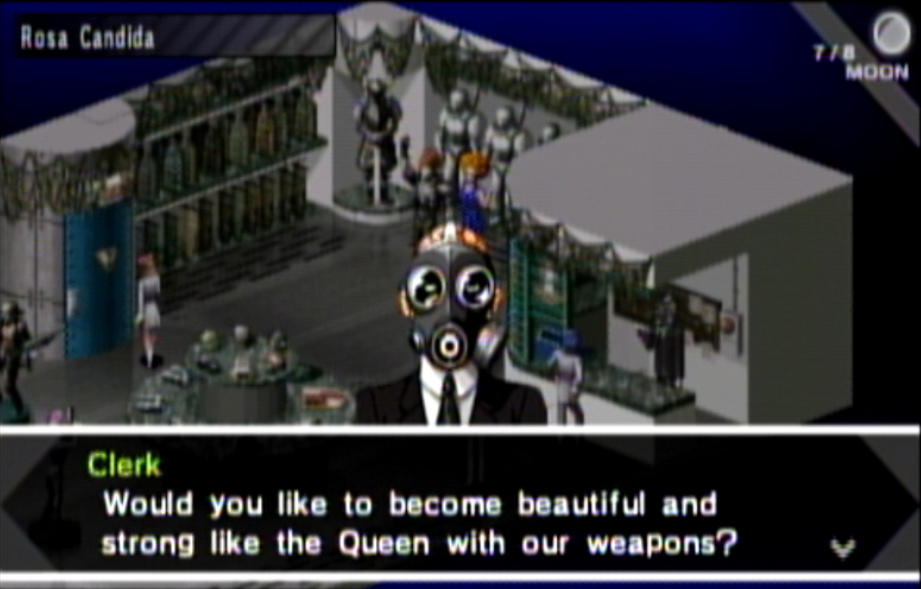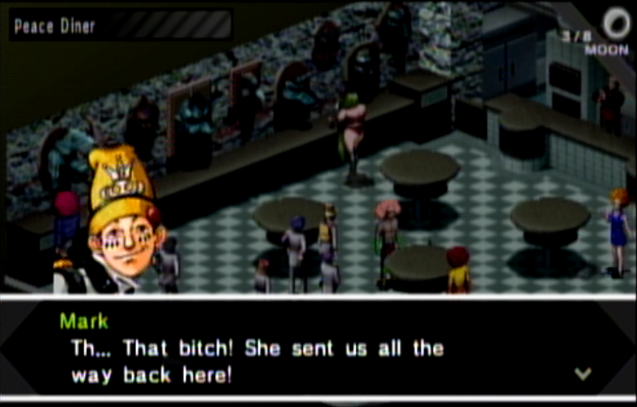 : “I’m sorry I was the cause of so much trouble for everyone. If I’d been a little more reliable, this wouldn’t have happened.”I think Persona 1 definitely has a different feel to it than the later games do: it’s a lot darker and also has a lot of weird body horror stuff in it (the Harem Queen as an example, but there’s some others) that are far more mainline SMT than what you’d see out of the later games. In fact, I was kind of surprised that they re-introduced guns (along with the Nuclear damage type, which left after Persona 2) in 5.