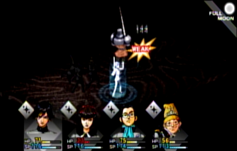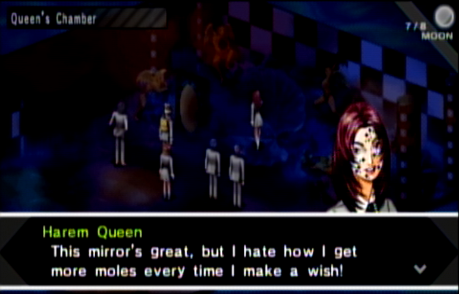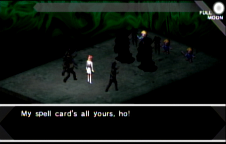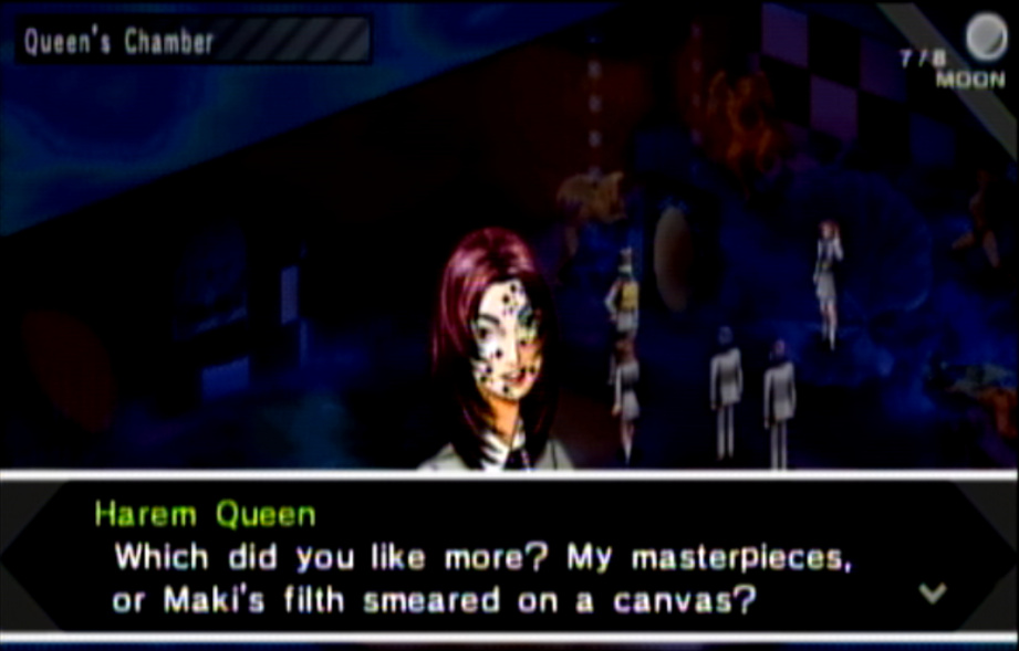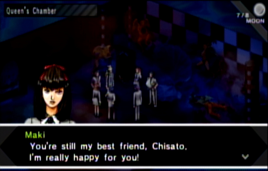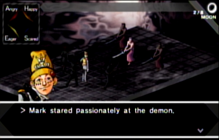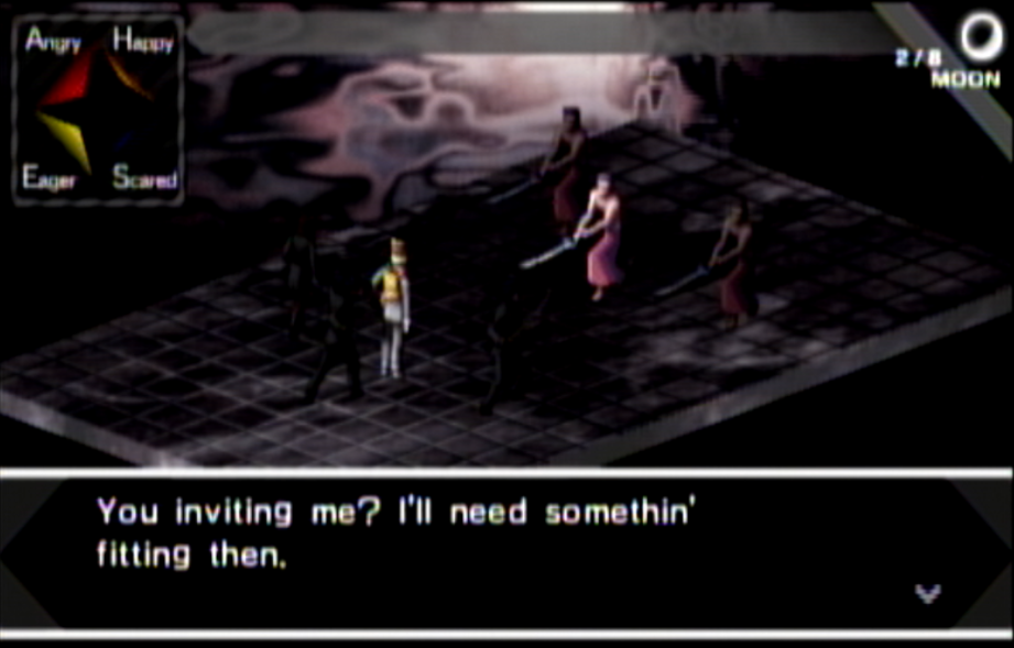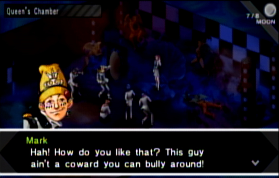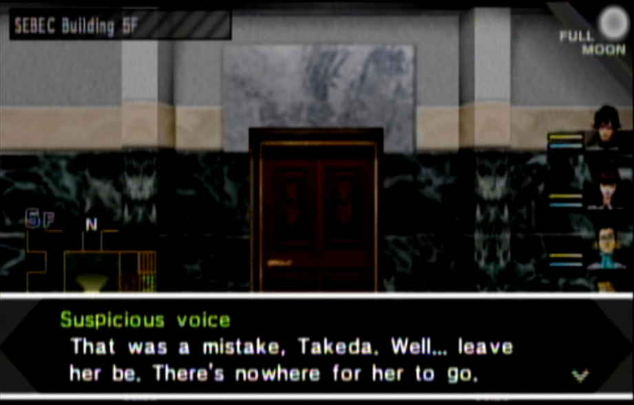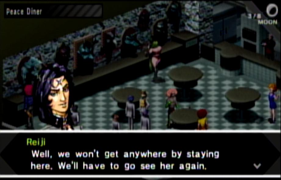 : “I’m sorry I was the cause of so much trouble for everyone. If I’d been a little more reliable, this wouldn’t have happened.”I think Persona 1 definitely has a different feel to it than the later games do: it’s a lot darker and also has a lot of weird body horror stuff in it (the Harem Queen as an example, but there’s some others) that are far more mainline SMT than what you’d see out of the later games. In fact, I was kind of surprised that they re-introduced guns (along with the Nuclear damage type, which left after Persona 2) in 5.