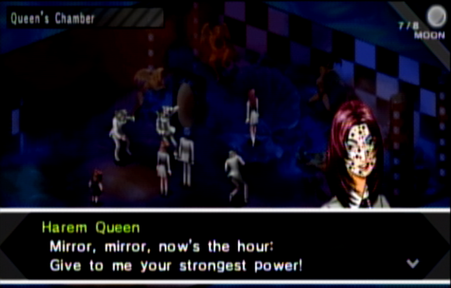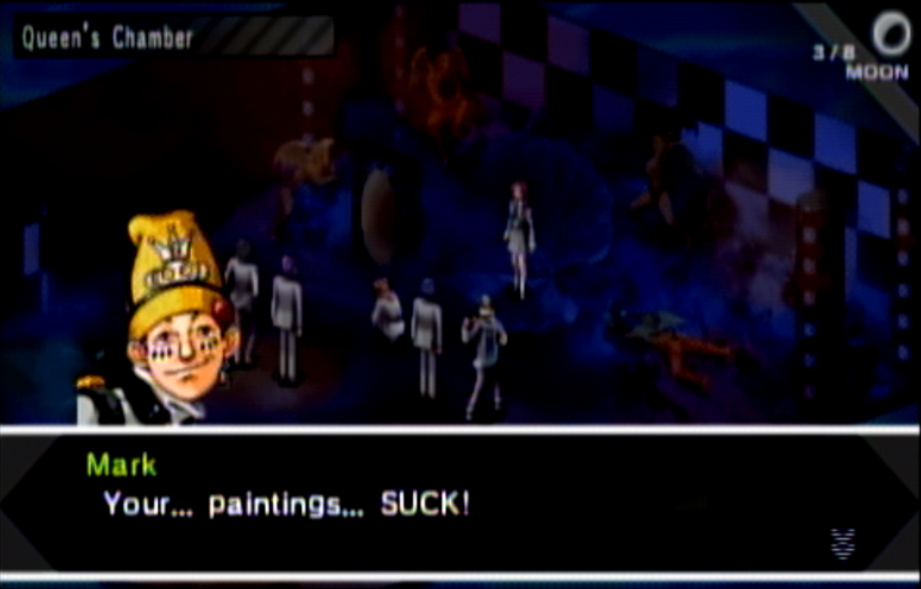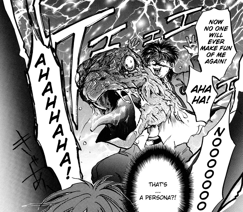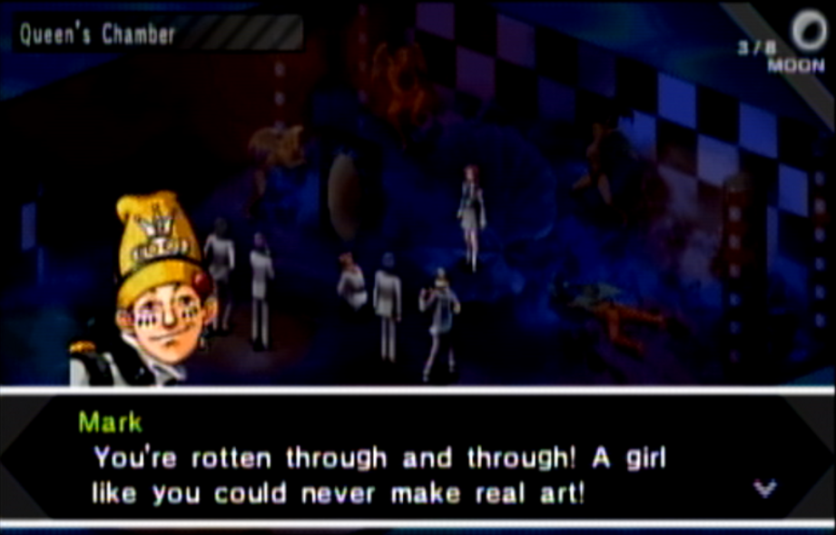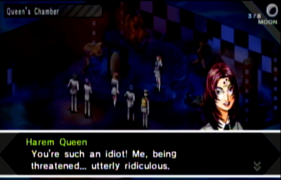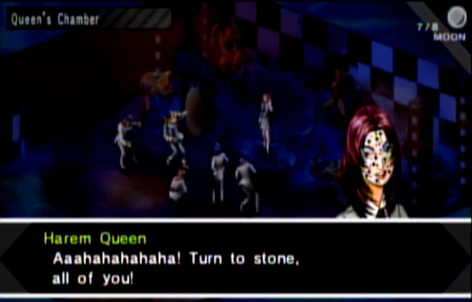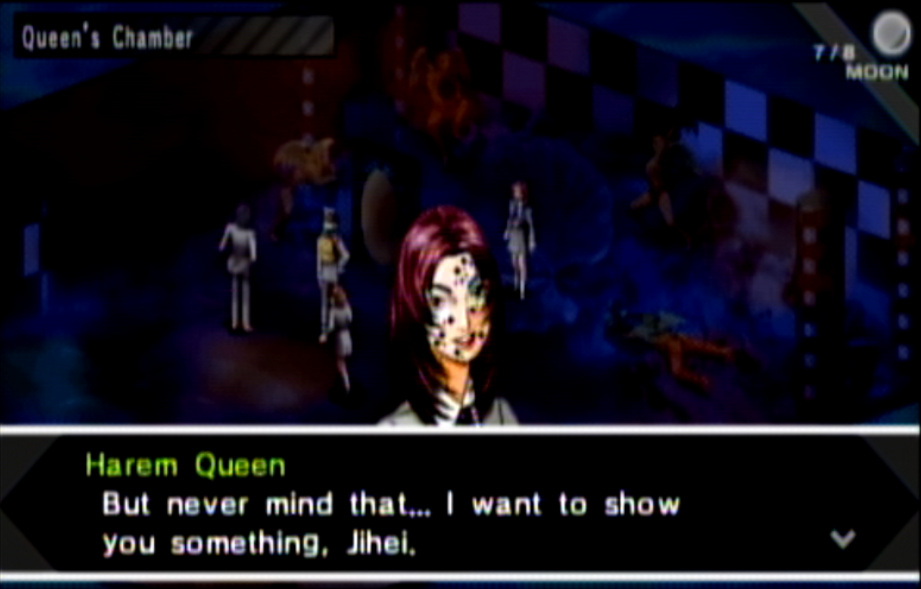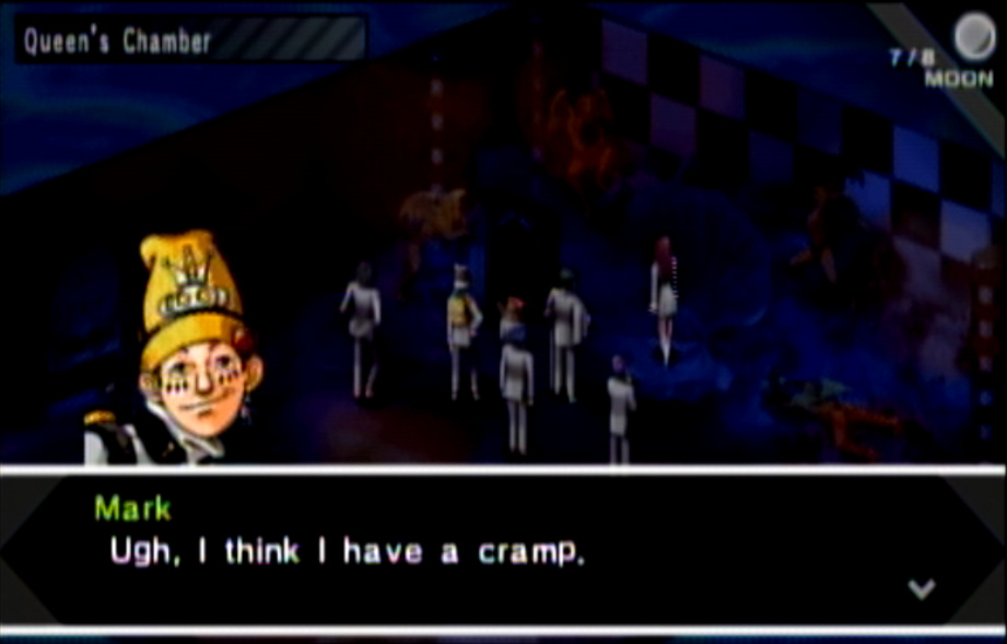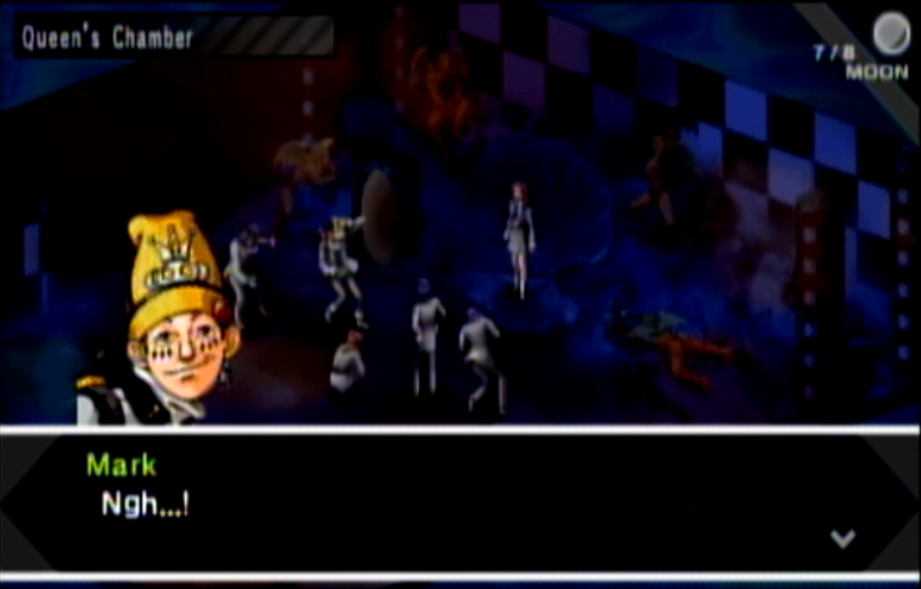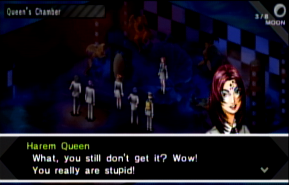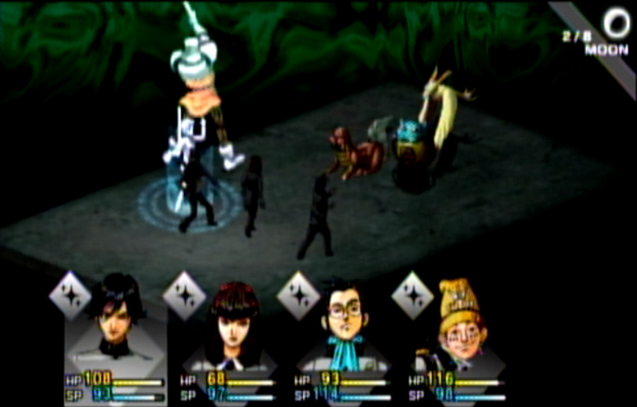 : “I’m sorry I was the cause of so much trouble for everyone. If I’d been a little more reliable, this wouldn’t have happened.”I think Persona 1 definitely has a different feel to it than the later games do: it’s a lot darker and also has a lot of weird body horror stuff in it (the Harem Queen as an example, but there’s some others) that are far more mainline SMT than what you’d see out of the later games. In fact, I was kind of surprised that they re-introduced guns (along with the Nuclear damage type, which left after Persona 2) in 5.