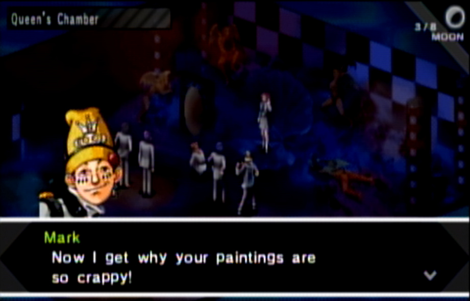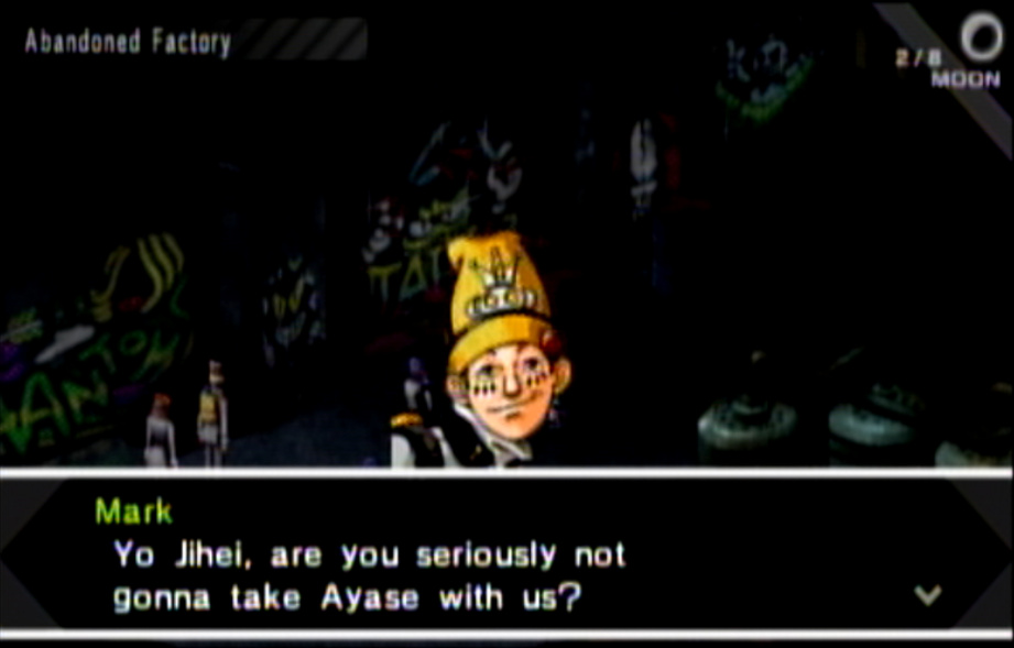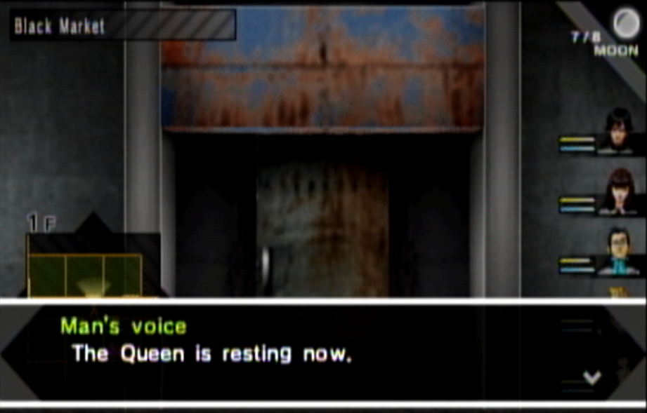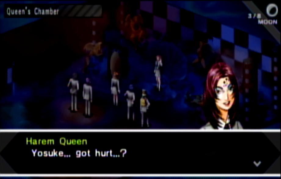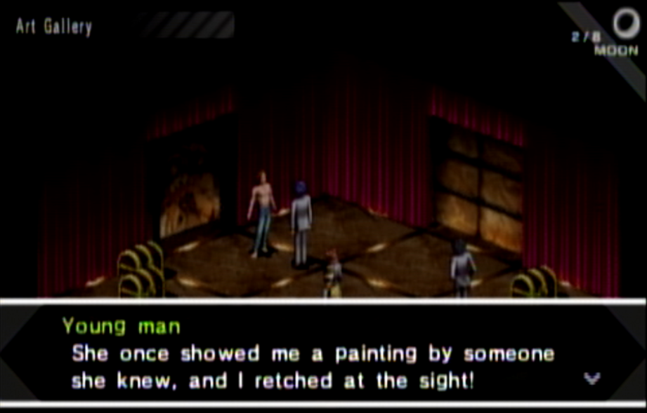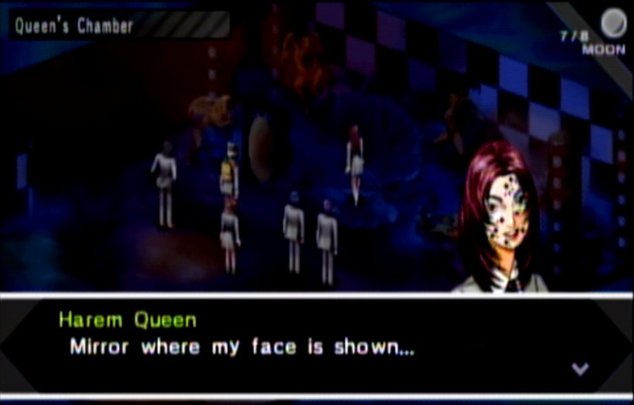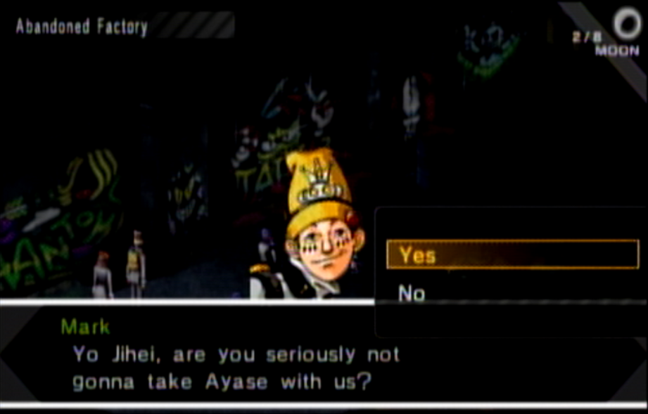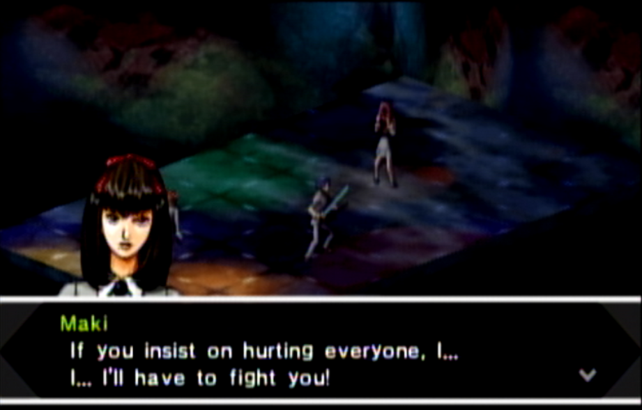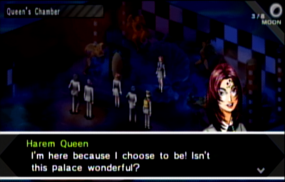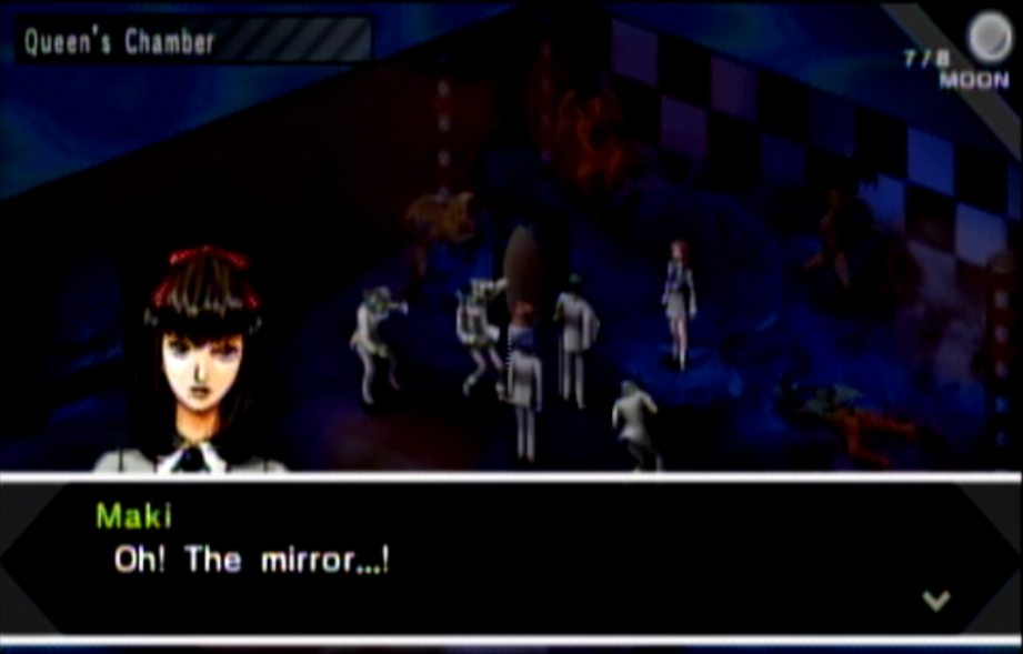 : “I’m sorry I was the cause of so much trouble for everyone. If I’d been a little more reliable, this wouldn’t have happened.”I think Persona 1 definitely has a different feel to it than the later games do: it’s a lot darker and also has a lot of weird body horror stuff in it (the Harem Queen as an example, but there’s some others) that are far more mainline SMT than what you’d see out of the later games. In fact, I was kind of surprised that they re-introduced guns (along with the Nuclear damage type, which left after Persona 2) in 5.