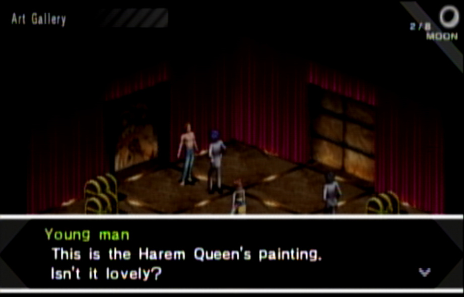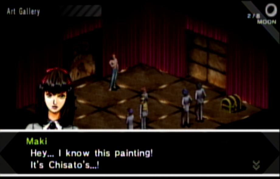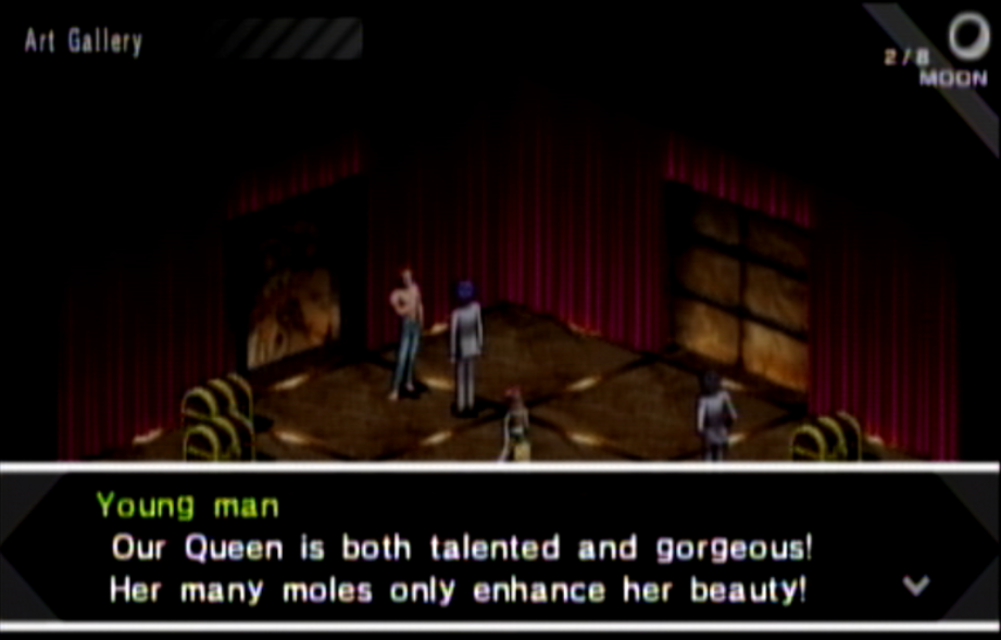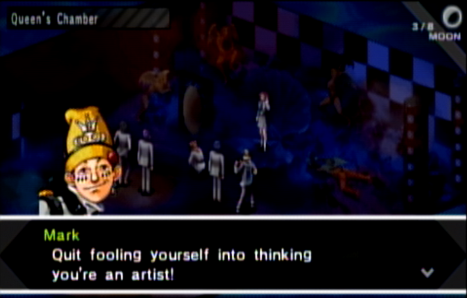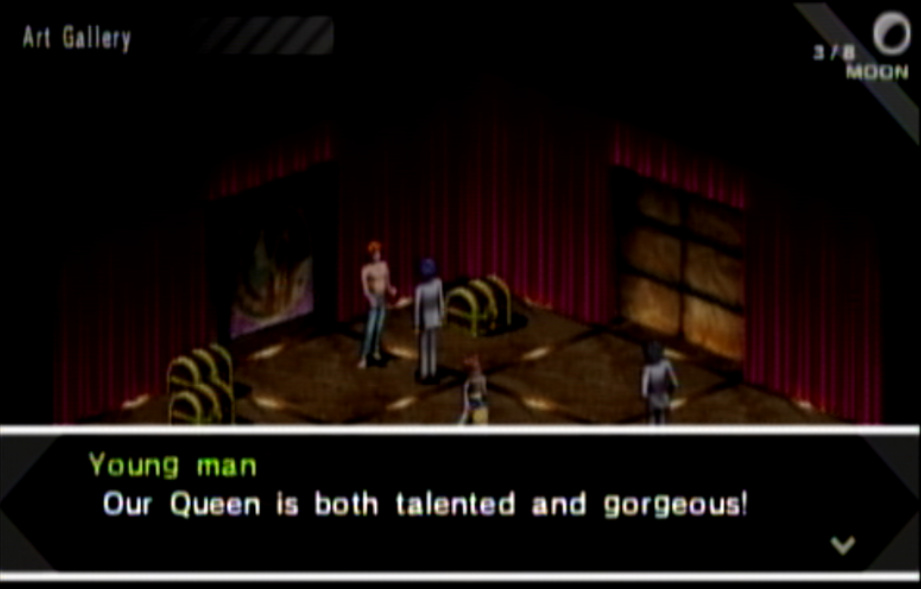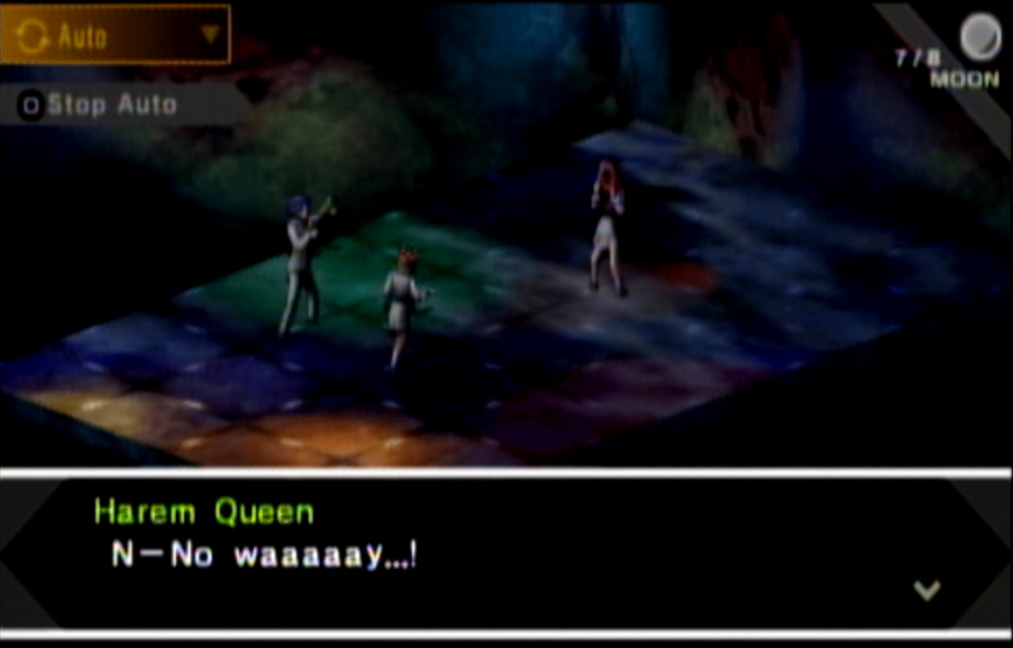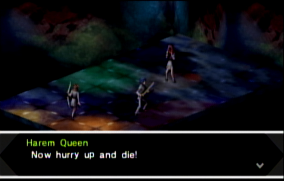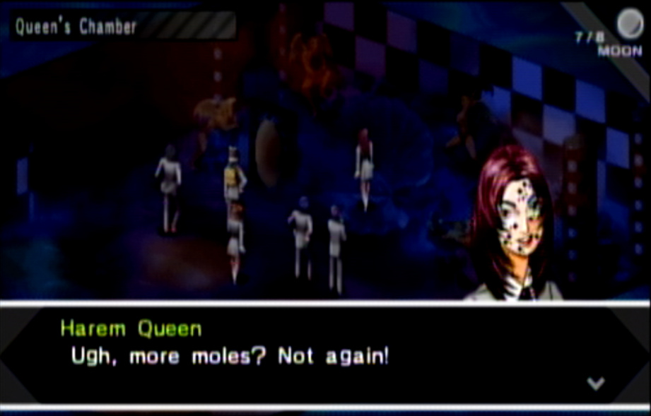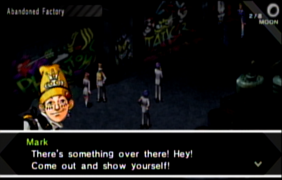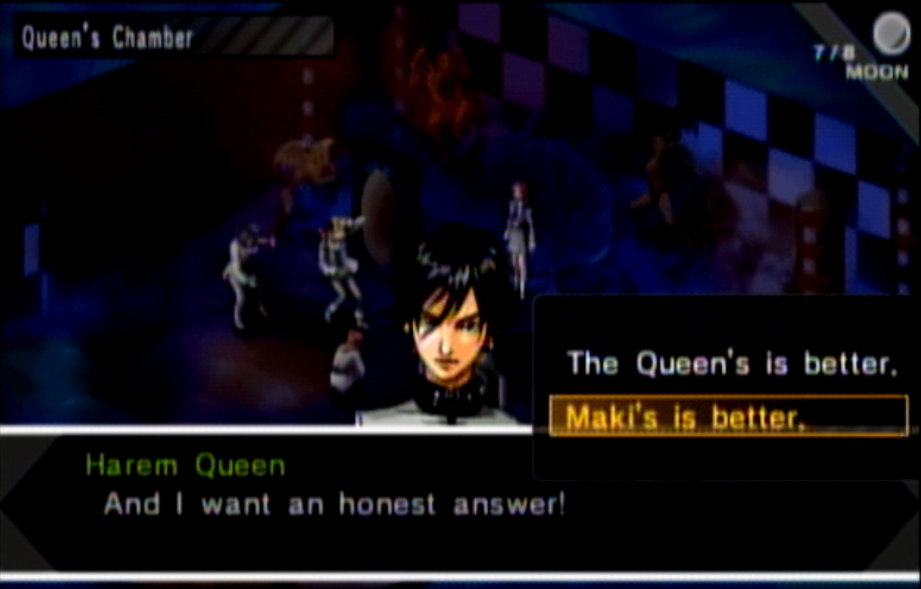 : “I’m sorry I was the cause of so much trouble for everyone. If I’d been a little more reliable, this wouldn’t have happened.”I think Persona 1 definitely has a different feel to it than the later games do: it’s a lot darker and also has a lot of weird body horror stuff in it (the Harem Queen as an example, but there’s some others) that are far more mainline SMT than what you’d see out of the later games. In fact, I was kind of surprised that they re-introduced guns (along with the Nuclear damage type, which left after Persona 2) in 5.