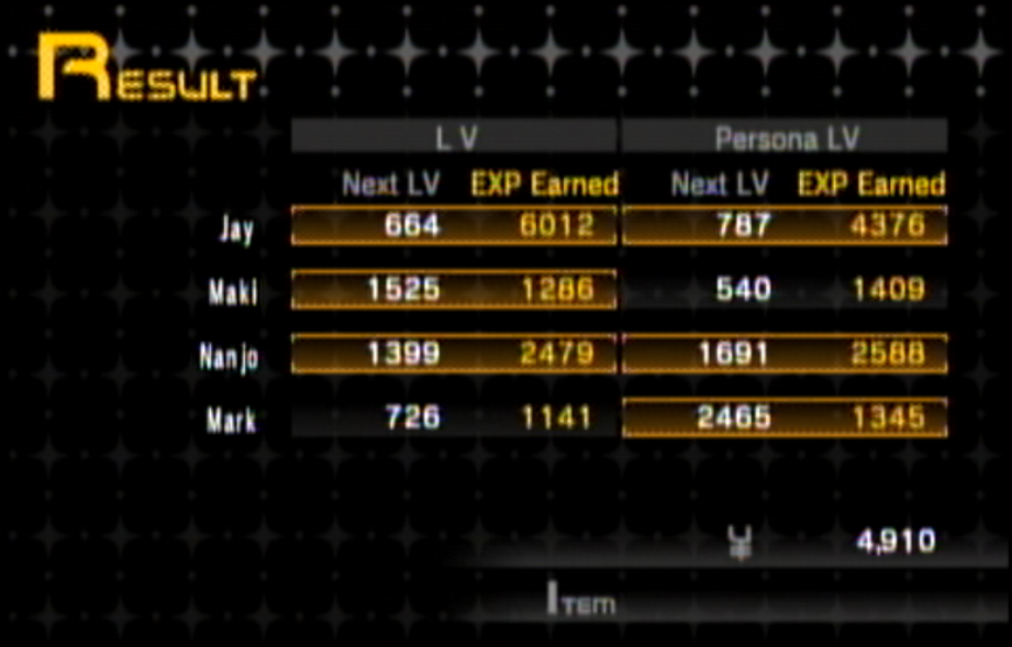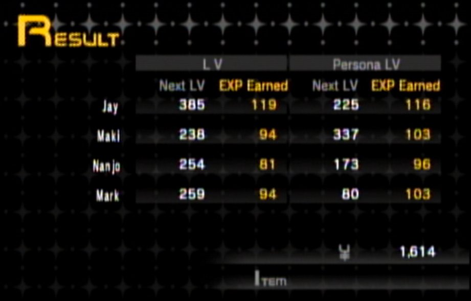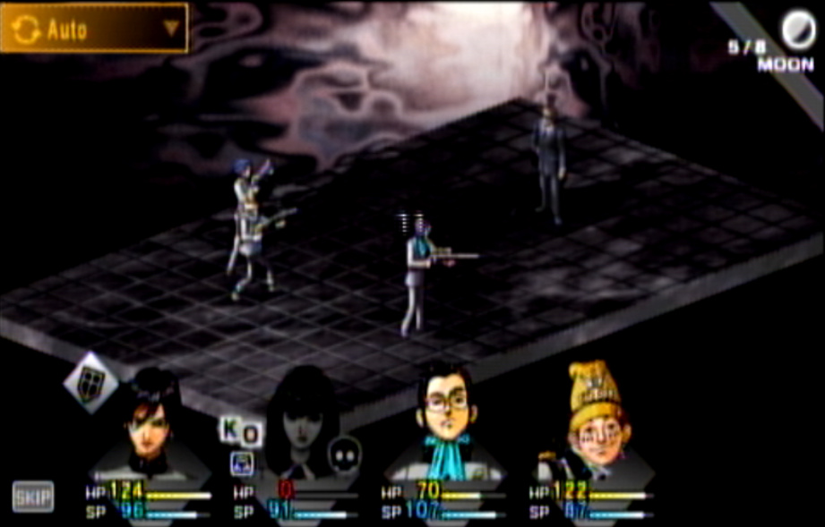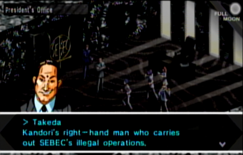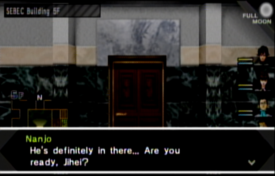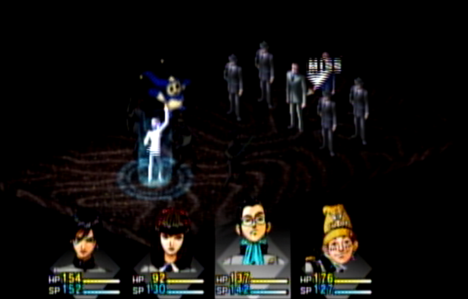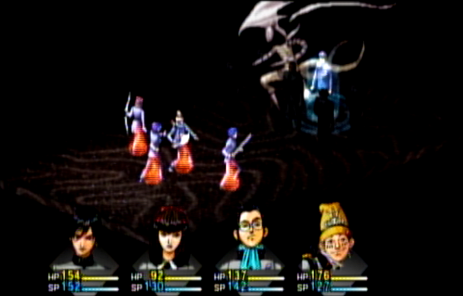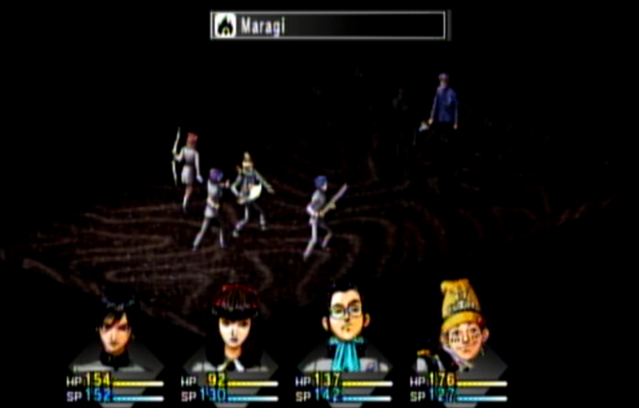 : I realized I forgot to link to the music, because that was something I wanted to talk about and then just forgot about. The SEBEC building actually has two different themes: one that was in the original PS1 release and a second one that was done for the PSP remake. : I’m not entirely sure why they replaced the music. Some people theorize that it had to do with re-branding Persona 1 for an audience that was used to the later game, while others think it’s because Atlus did it out of respect for the original composer, who apparently died in 2002. In any case, most people seem to like the PS1 version better and it’s kind of a wonder to me that no one has made a hack that restores the original soundtrack to the PSP release. : Then you’ve got this one, which plays during the fight with Takeda. Bloody Destiny is another replacement song, and the reason for this one is more obvious: the PS1 version used what was basically a remix of Shin Megami Tensei II’s boss fight theme. Like A Lone Prayer and the overworld theme, Bloody Destiny has incomprehensible lyrics.Yeah, one of the reasons that I dislike actually playing P1 is that exp is tied to either the amount of damage you deal or the number of enemies you kill, which means that even with moderate investment in Agility Jay will be far and away the best party member due to getting more exp than everyone else. Mark ends up the lowest-leveled, because he’s slow as a rock and has terrible starting attacks. IME playing this game though, Maki was better off than Nanjo, but maybe that’s just the way the dice fell or something.