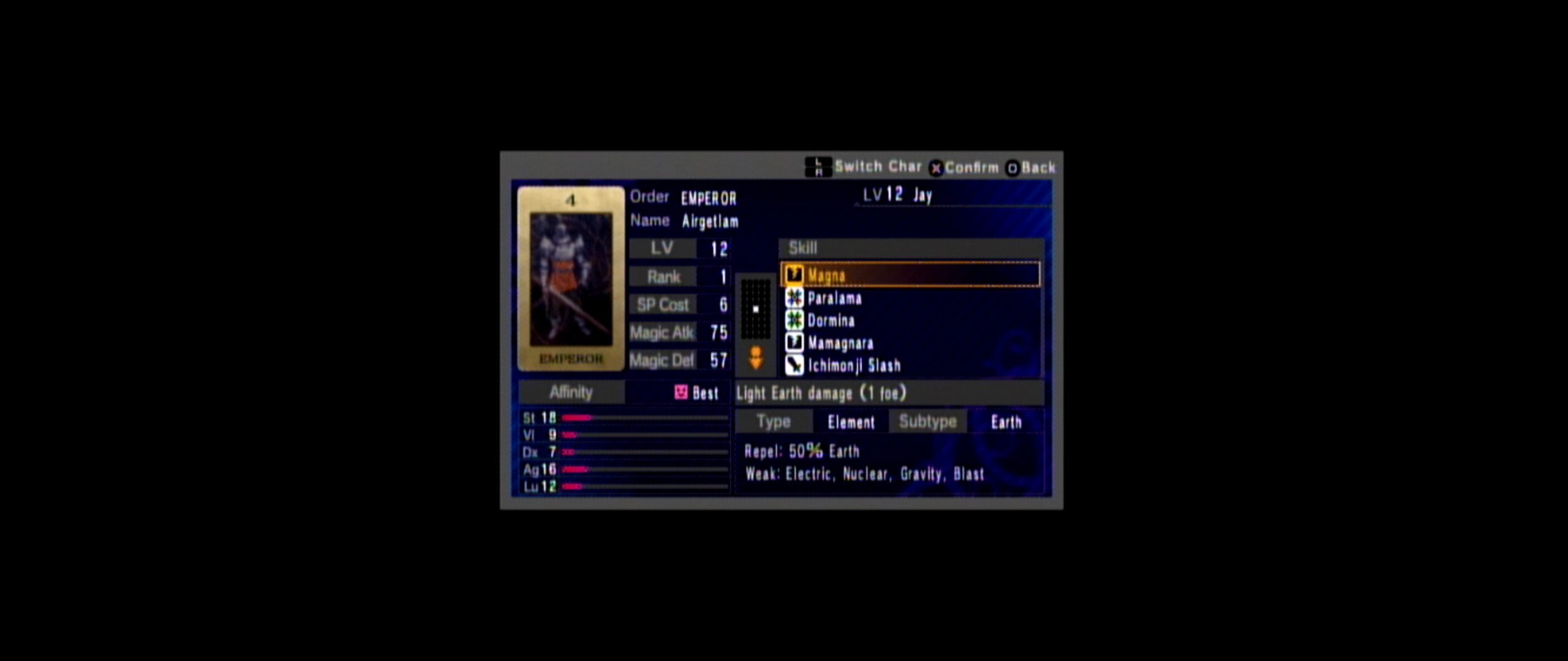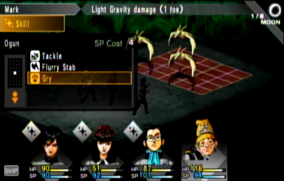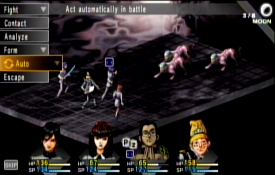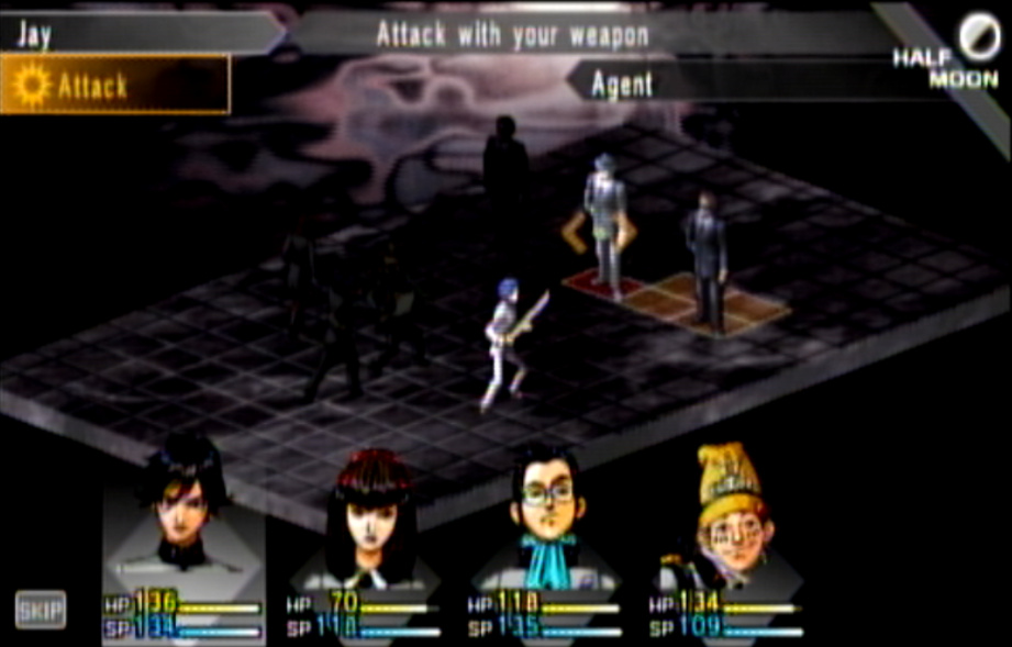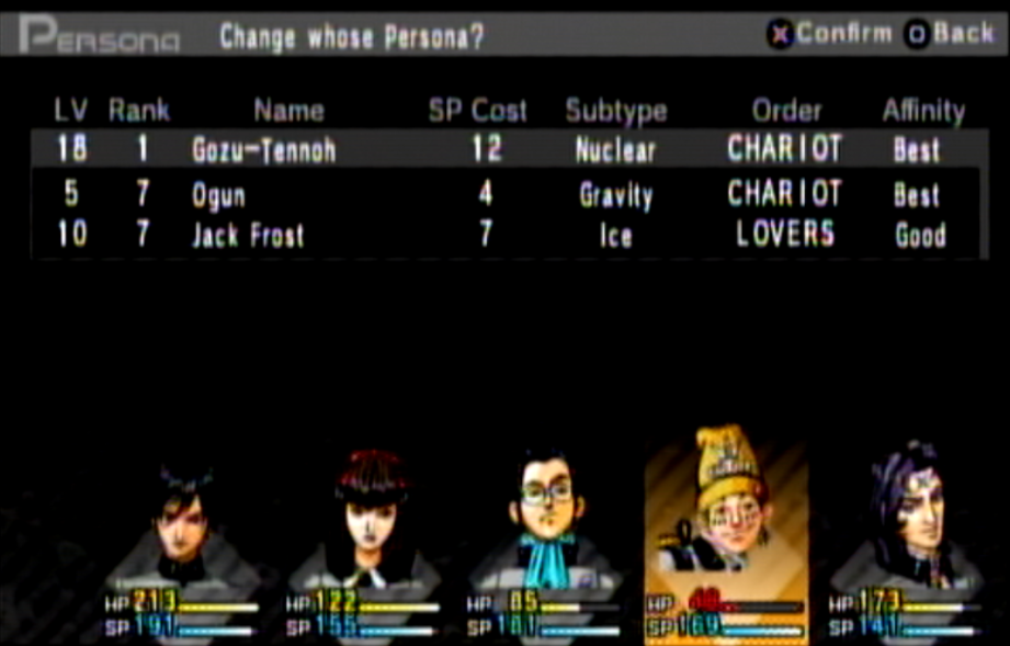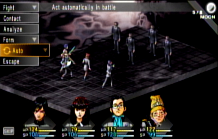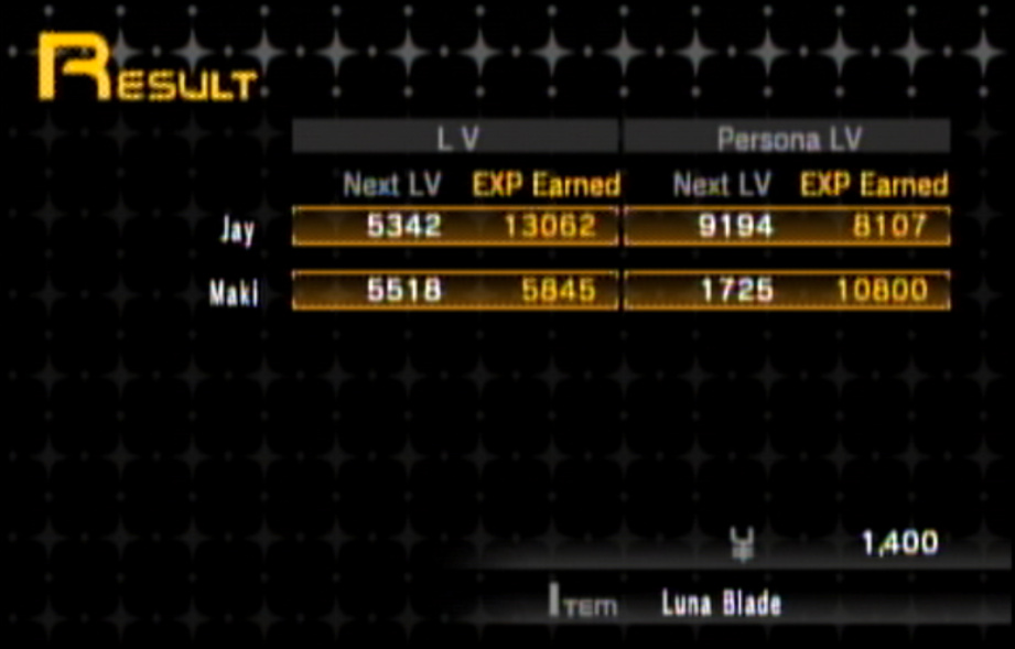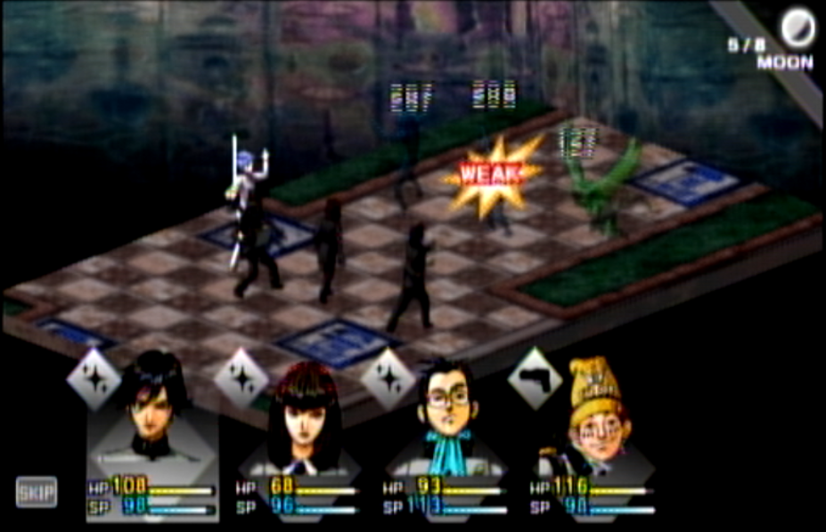 : I realized I forgot to link to the music, because that was something I wanted to talk about and then just forgot about. The SEBEC building actually has two different themes: one that was in the original PS1 release and a second one that was done for the PSP remake. : I’m not entirely sure why they replaced the music. Some people theorize that it had to do with re-branding Persona 1 for an audience that was used to the later game, while others think it’s because Atlus did it out of respect for the original composer, who apparently died in 2002. In any case, most people seem to like the PS1 version better and it’s kind of a wonder to me that no one has made a hack that restores the original soundtrack to the PSP release. : Then you’ve got this one, which plays during the fight with Takeda. Bloody Destiny is another replacement song, and the reason for this one is more obvious: the PS1 version used what was basically a remix of Shin Megami Tensei II’s boss fight theme. Like A Lone Prayer and the overworld theme, Bloody Destiny has incomprehensible lyrics.Yeah, one of the reasons that I dislike actually playing P1 is that exp is tied to either the amount of damage you deal or the number of enemies you kill, which means that even with moderate investment in Agility Jay will be far and away the best party member due to getting more exp than everyone else. Mark ends up the lowest-leveled, because he’s slow as a rock and has terrible starting attacks. IME playing this game though, Maki was better off than Nanjo, but maybe that’s just the way the dice fell or something.
