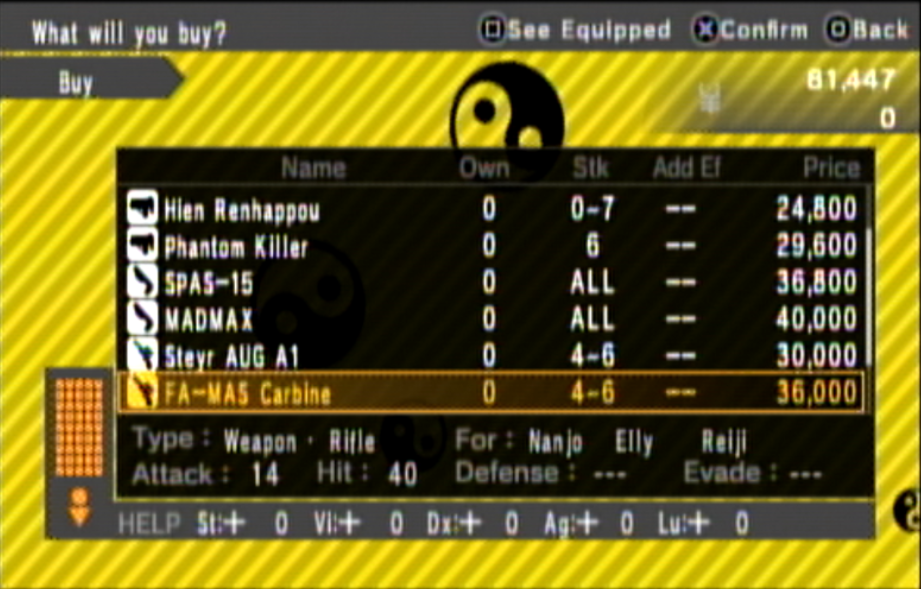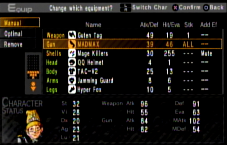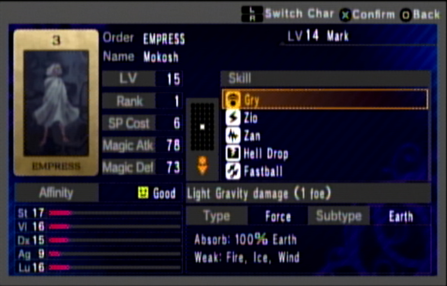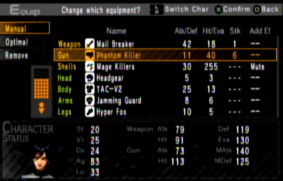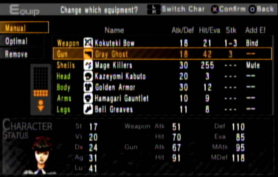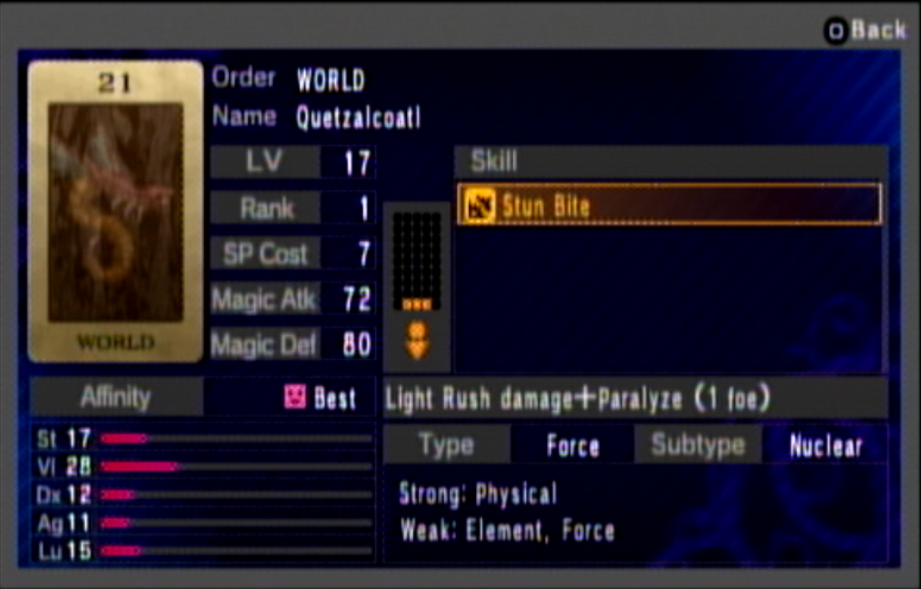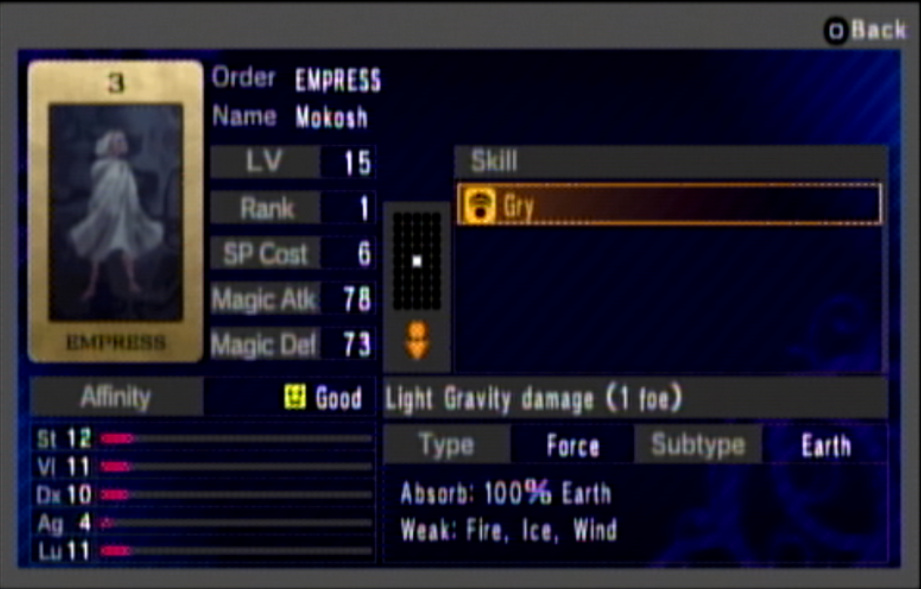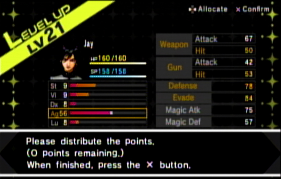 : I realized I forgot to link to the music, because that was something I wanted to talk about and then just forgot about. The SEBEC building actually has two different themes: one that was in the original PS1 release and a second one that was done for the PSP remake. : I’m not entirely sure why they replaced the music. Some people theorize that it had to do with re-branding Persona 1 for an audience that was used to the later game, while others think it’s because Atlus did it out of respect for the original composer, who apparently died in 2002. In any case, most people seem to like the PS1 version better and it’s kind of a wonder to me that no one has made a hack that restores the original soundtrack to the PSP release. : Then you’ve got this one, which plays during the fight with Takeda. Bloody Destiny is another replacement song, and the reason for this one is more obvious: the PS1 version used what was basically a remix of Shin Megami Tensei II’s boss fight theme. Like A Lone Prayer and the overworld theme, Bloody Destiny has incomprehensible lyrics.Yeah, one of the reasons that I dislike actually playing P1 is that exp is tied to either the amount of damage you deal or the number of enemies you kill, which means that even with moderate investment in Agility Jay will be far and away the best party member due to getting more exp than everyone else. Mark ends up the lowest-leveled, because he’s slow as a rock and has terrible starting attacks. IME playing this game though, Maki was better off than Nanjo, but maybe that’s just the way the dice fell or something.
