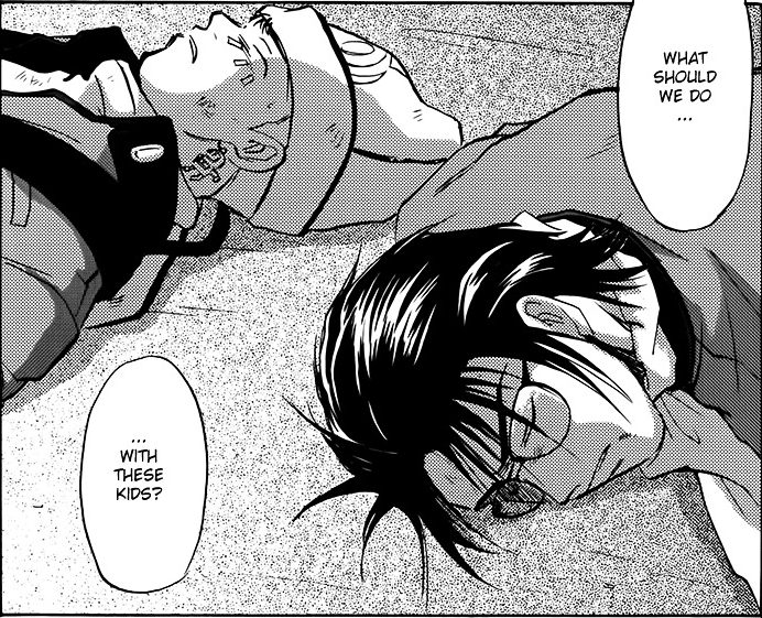 : “Ungh.. where am I…? Oh, Jihei. You’re all right. Looks like everyone’s unhurt. We certainly have the devil’s luck.”