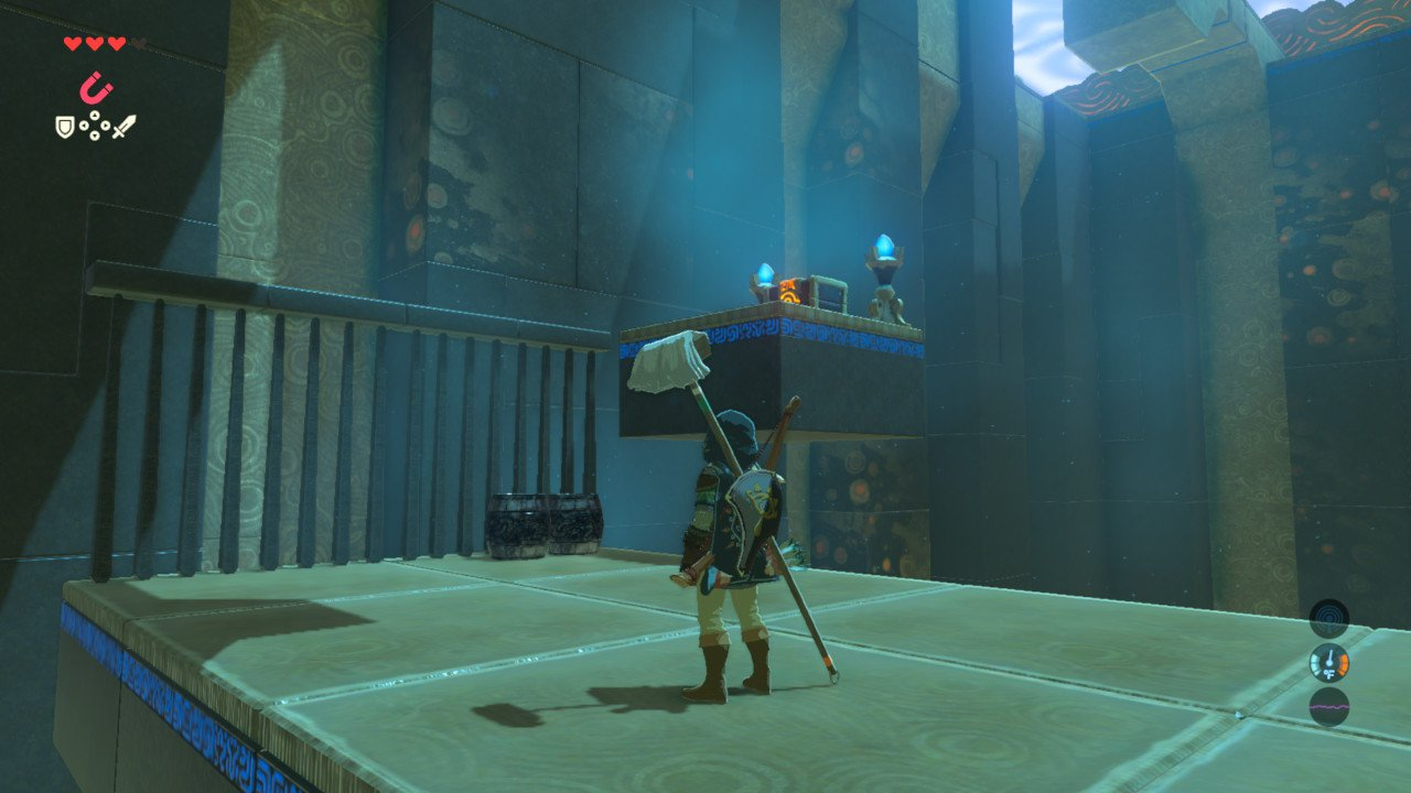 This is in the Ree Dahee shrine and I cannot figure out how to get to this chest that probably only has 20 rupees in it. I feel like it involves those metal barrels, but they’re not exactly stable footing. I’ve gone on and done a bunch of other stuff but I’ve stamped this chest and returned to it twice now because it’s