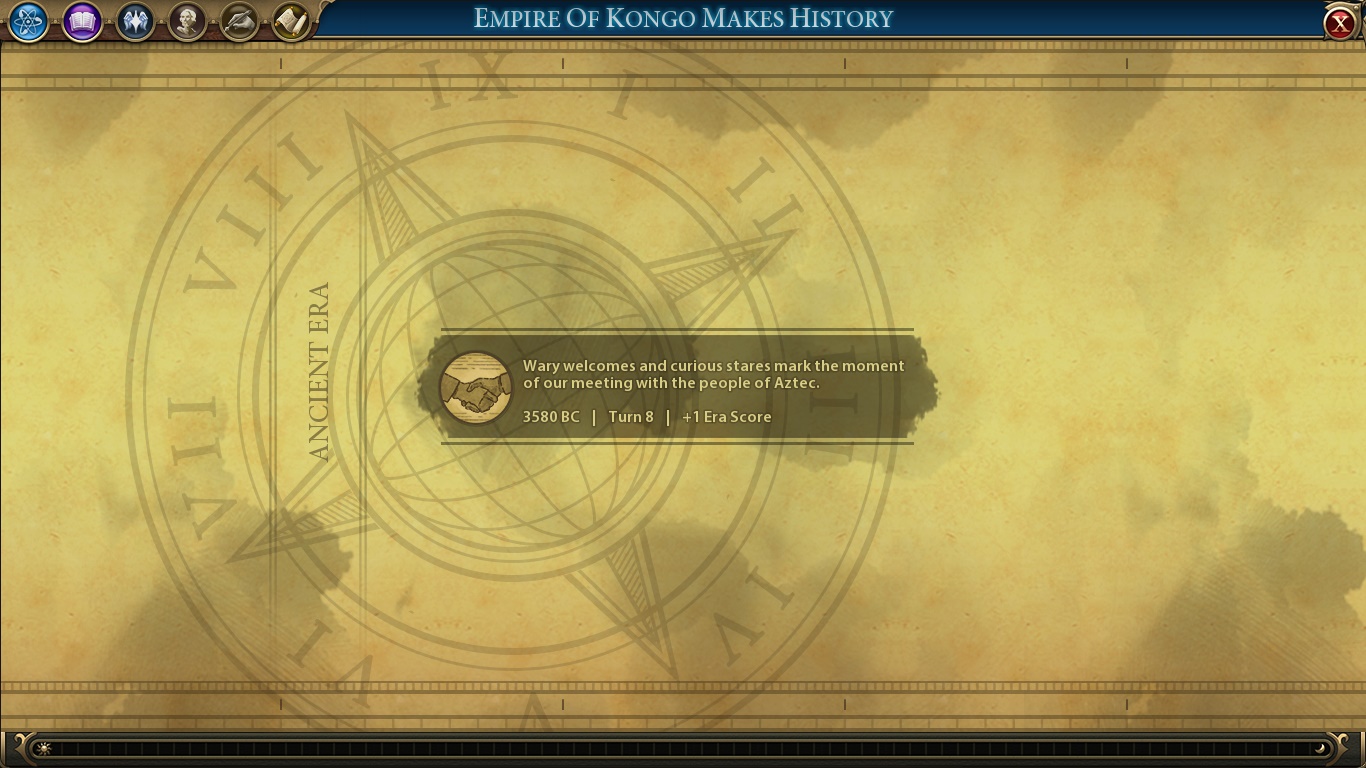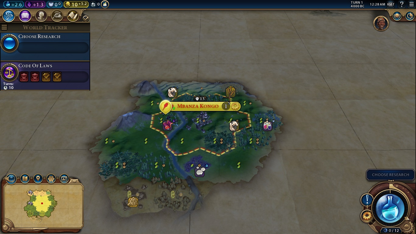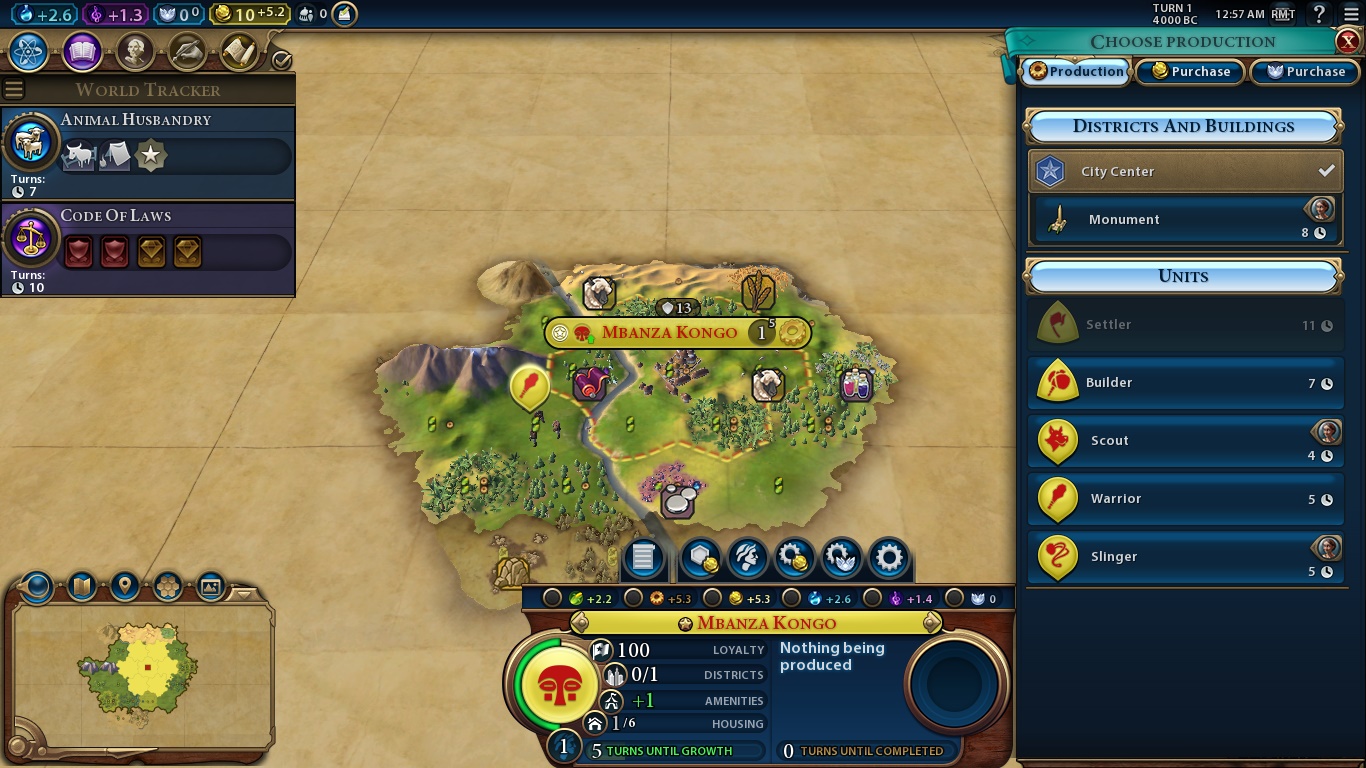 Here we are. The game in all its cartoonish glory. There are a bunch of things we can see right away. Let’s start from the start: The buttons on the upper left are, respectively, how much we earn of science, culture, faith, gold and envoys, with the report button being the last one. Science allows us to evolve technologically, culture makes our state/society as a whole more complex, faith is necessary to found a religion and everything related to it. As Kongo, our faith points will be expended in other things. Gold is, obviously, our currency. An empire in debt is highly inefficient, and we can even rush-buy some things if we have enough moneys. Envoys are sort of diplomats that we send to city-states to be their suzerain and earn unique bonuses.