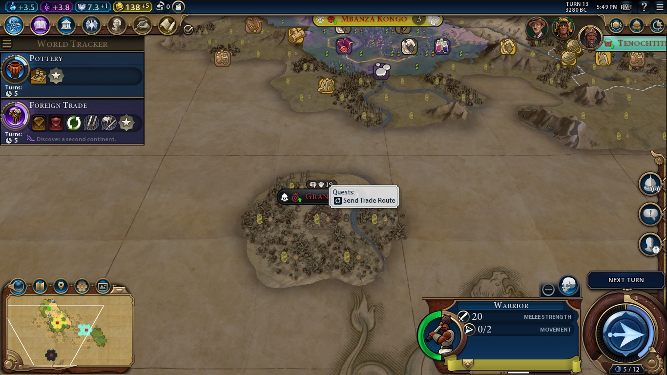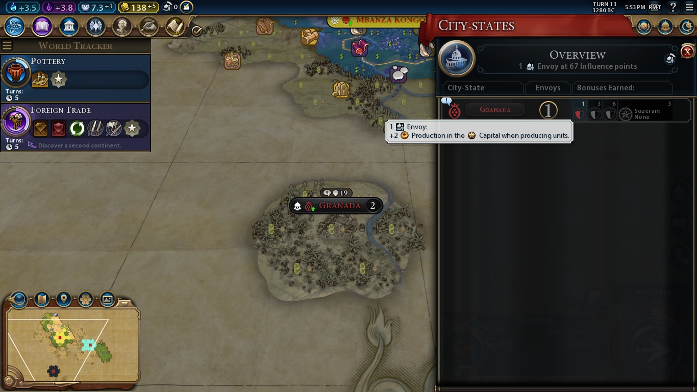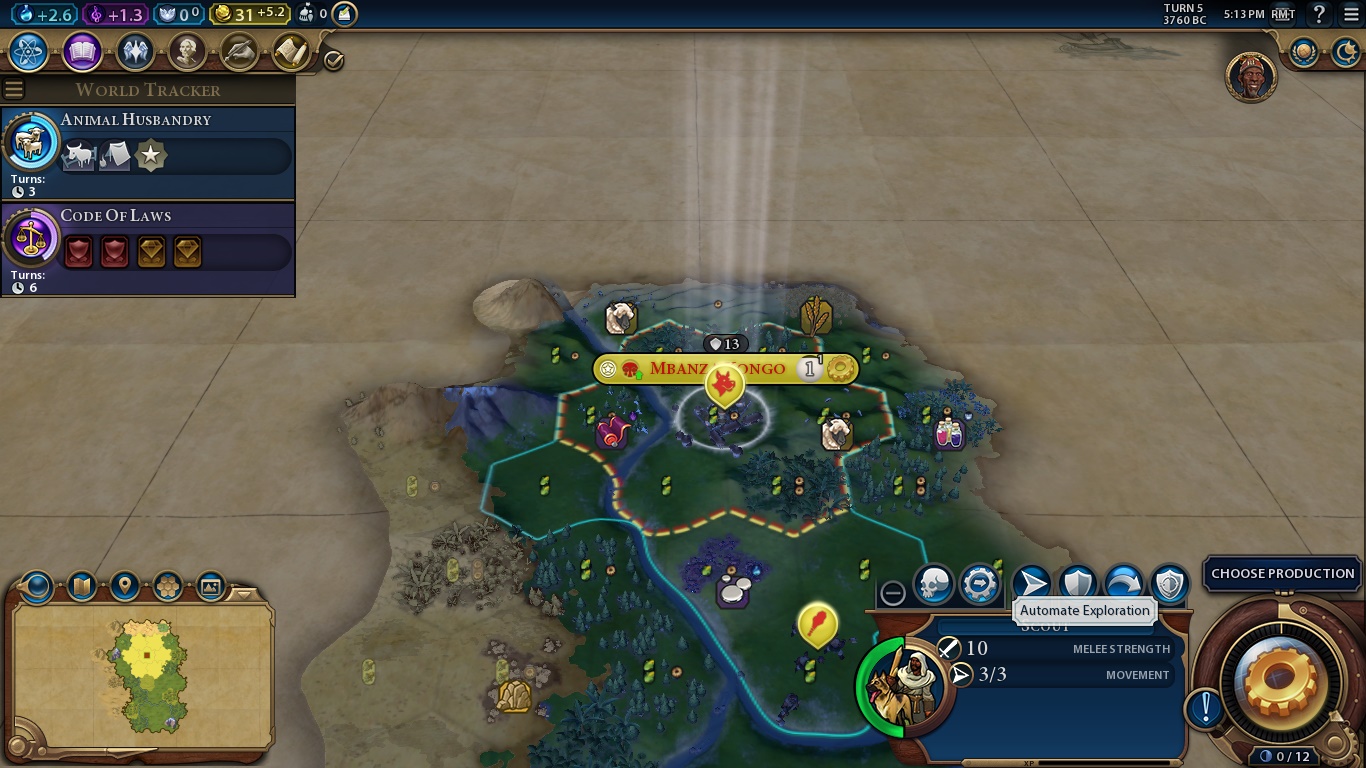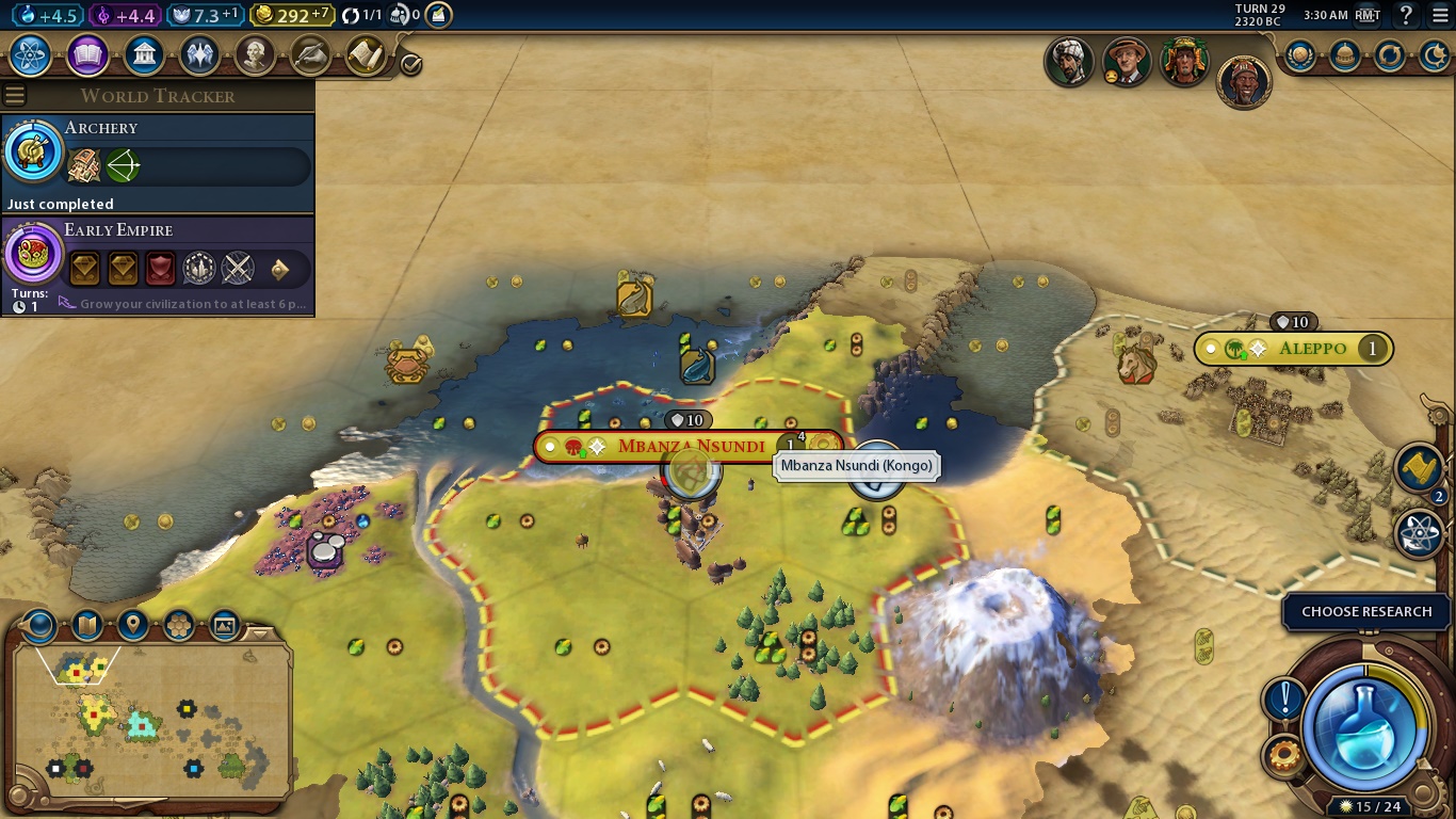 Here we are. The game in all its cartoonish glory. There are a bunch of things we can see right away. Let’s start from the start: The buttons on the upper left are, respectively, how much we earn of science, culture, faith, gold and envoys, with the report button being the last one. Science allows us to evolve technologically, culture makes our state/society as a whole more complex, faith is necessary to found a religion and everything related to it. As Kongo, our faith points will be expended in other things. Gold is, obviously, our currency. An empire in debt is highly inefficient, and we can even rush-buy some things if we have enough moneys. Envoys are sort of diplomats that we send to city-states to be their suzerain and earn unique bonuses.
