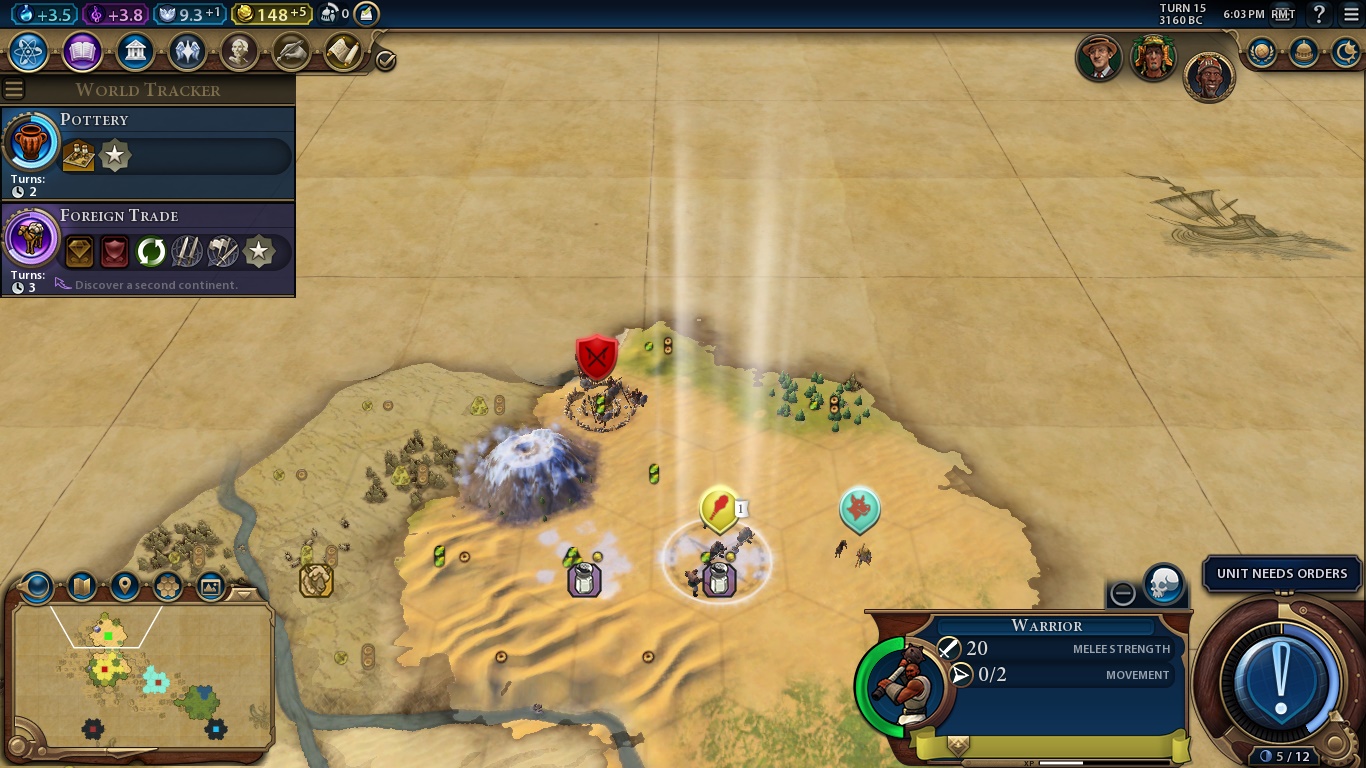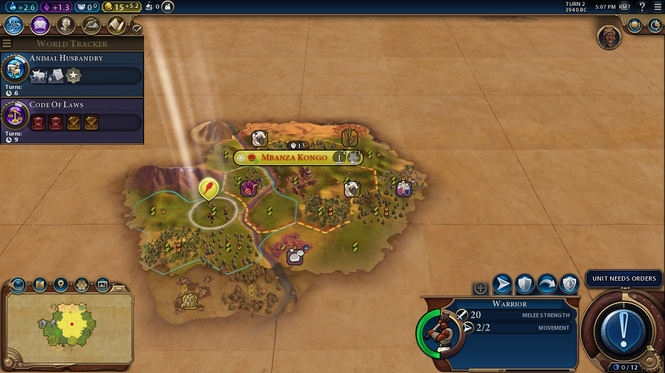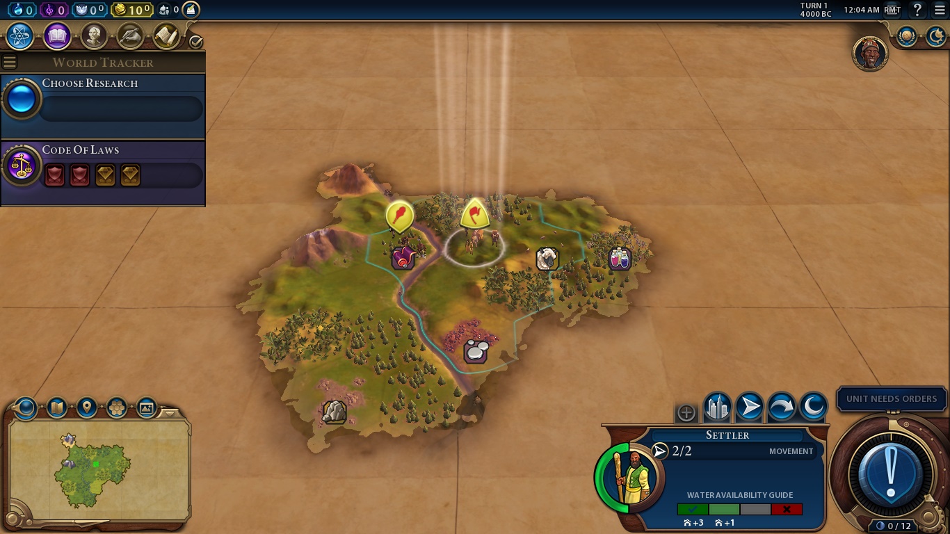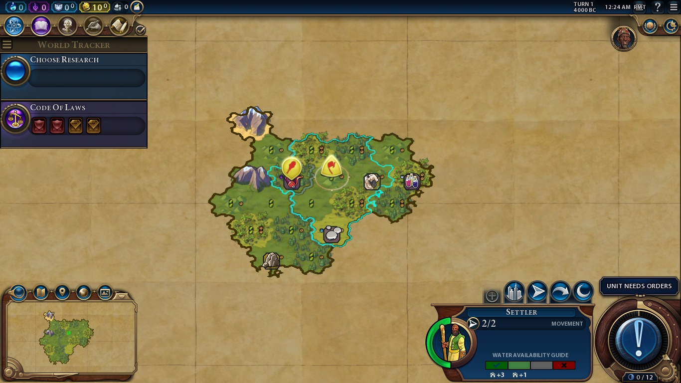 On the bottom right, we have the aforementioned Era Score, our selected unit, Settler, stats and a huge AN UNIT NEEDS ORDERS BUTTON, which is the “Next Turn” button when you finished all the mandatory tasks for a turn.