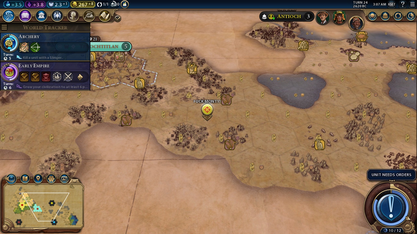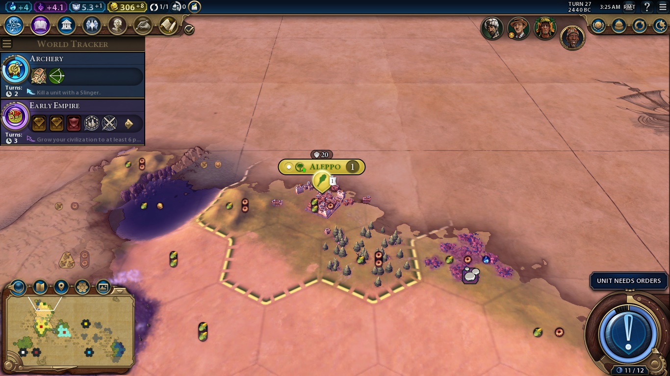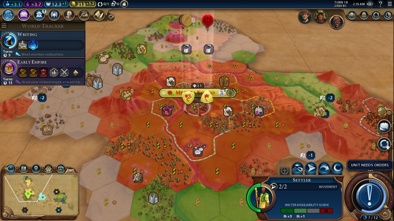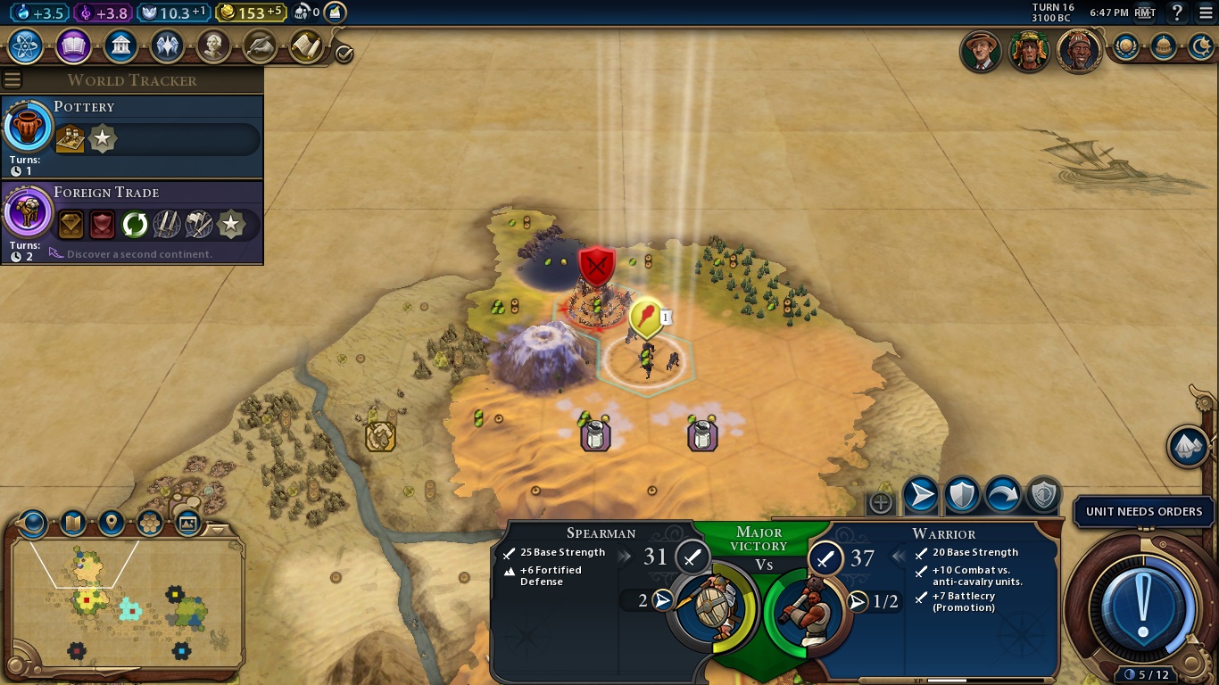On the bottom right, we have the aforementioned Era Score, our selected unit, Settler, stats and a huge AN UNIT NEEDS ORDERS BUTTON, which is the “Next Turn” button when you finished all the mandatory tasks for a turn.