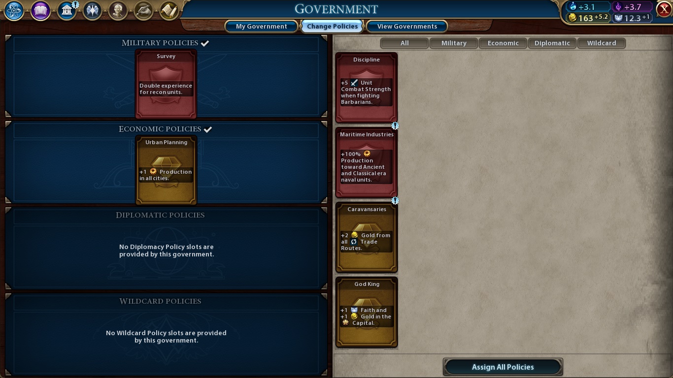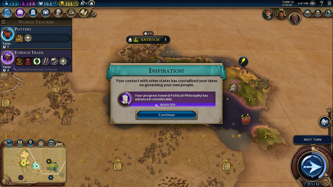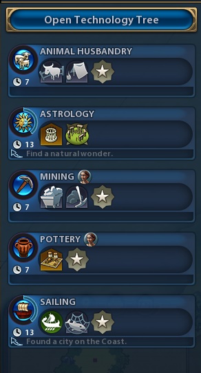 These are the available techs, and we can see the tech tree if we click the button. Those small symbols beneath each tech’s name show what we can build when our civilization discovers the tech. The small arrows under Astrology and Sailing are Eureka Moments. If you do what’s written, you earn a nice boost to that tech’s research (something like 40%, but I’m not completely sure). The civics tree has its own Eureka mechanic, it’s called Inspiration and works the same way.