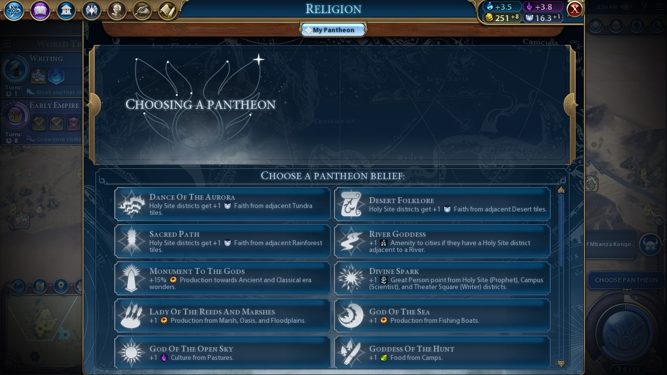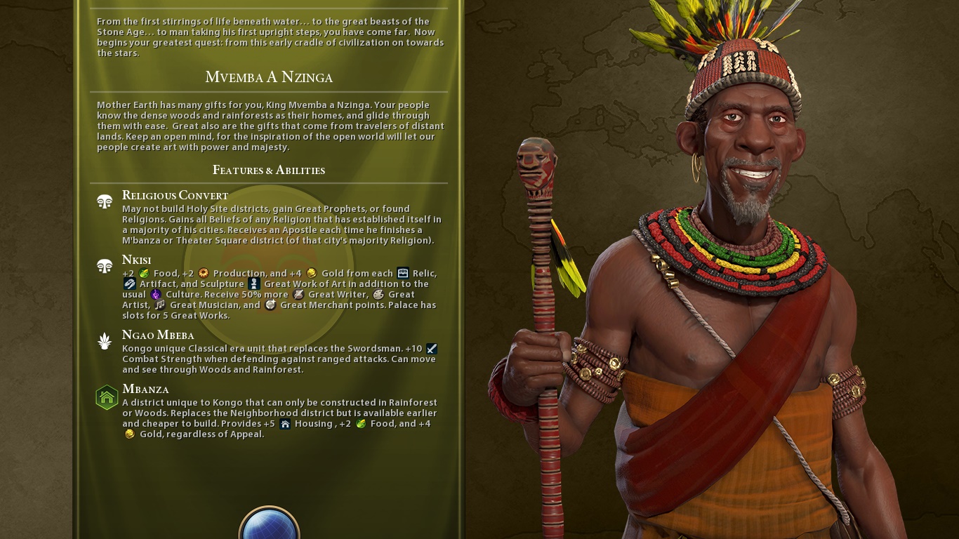 So, Kongo is a civilization for whom there’s one victory type less: the Religious one. They can’t build holy sites, gain Great Prophets nor found religions by themselves. Instead, they use the beliefs from the religion established in the majority of their cities. Neat. The tradeoff is that they’re geared for culture, and religious relics are even better for them in this sense thanks to their Unique Ability: Nkisi. It gives them more food, more gold and more production for each Relic, Artifact and Sculpture in their museums. It’s also easier for them to generate Great People.