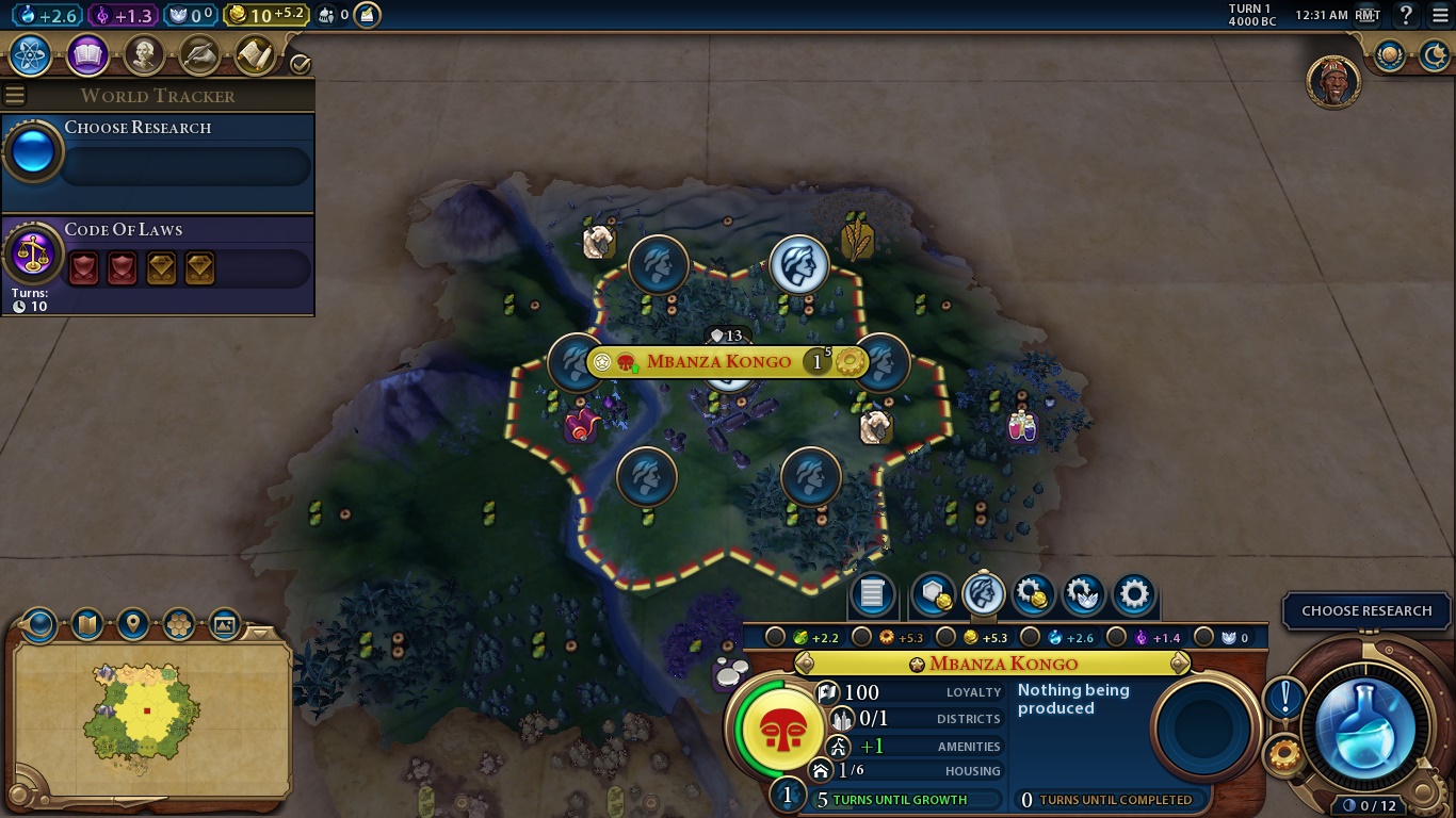 Right, now that we just built Mbanza Kongo overnight and from nothing but dust, we can talk a bit about the game proper. We have a bunch of resources near our capital and I’ll explain what they are, but first things first. You may notice that by settling a city we can see that our empire is now producing a bit of science, culture etc. That’s because of the main Civilization mechanic: citizens.