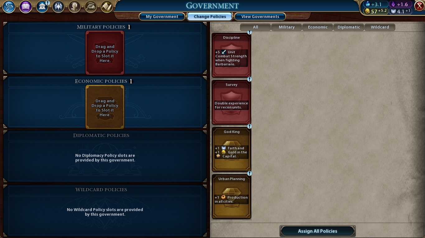 Looking left, we have the tech tree, where we can choose what to research, see further techs and their requirements. The civics tree is the tech tree for culture, and, as we can see in the pic, we’re already researching Code of Laws. It’s the mandatory first civic. Right next to it, we have the Great People and Governors buttons. More on those later. The last one is the history timeline, a Rise and Fall feature where you can see the proudest moments from your civilization. These points translate into Era Score (you can see it on the lower right, the 0/12 next to the small moon symbol). The game’s timeline is split in eras: Ancient, Classical, Medieval, Renaissance, Industrial, Modern, Atomic and Information.