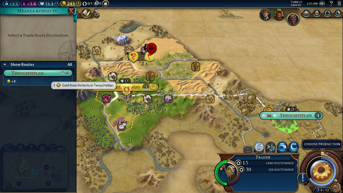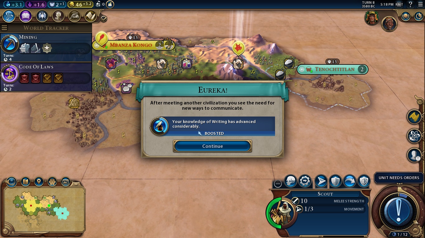 On the top right, we have the turn, the year, the local time, RMT is the radial measuring tool, a mod which allows you to see until where your proximity bonus bonuses apply, the Civilopedia and the options. Also, there’s a small portrait of Mvemba a Nzinga, a world ranking button where you can see how you currently stand in all victory types and an Era button, which we’ll delve deeper later.