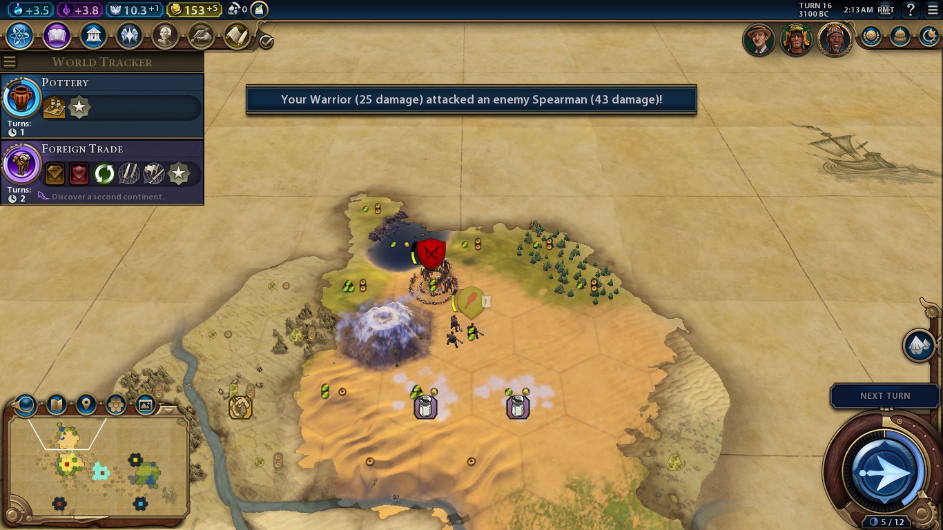 So we go back to the default screen. That small club next to our capital is our Warrior, the earliest military melee unit. You start with one of them every game, and they’re useful to scout your surroundings and providing some defense against barbarians. Barbarians are mob-ish camps which, like city-states, can’t win the game. However, they’re always hostile and can wreak havoc in your civilization if not properly dealt with.