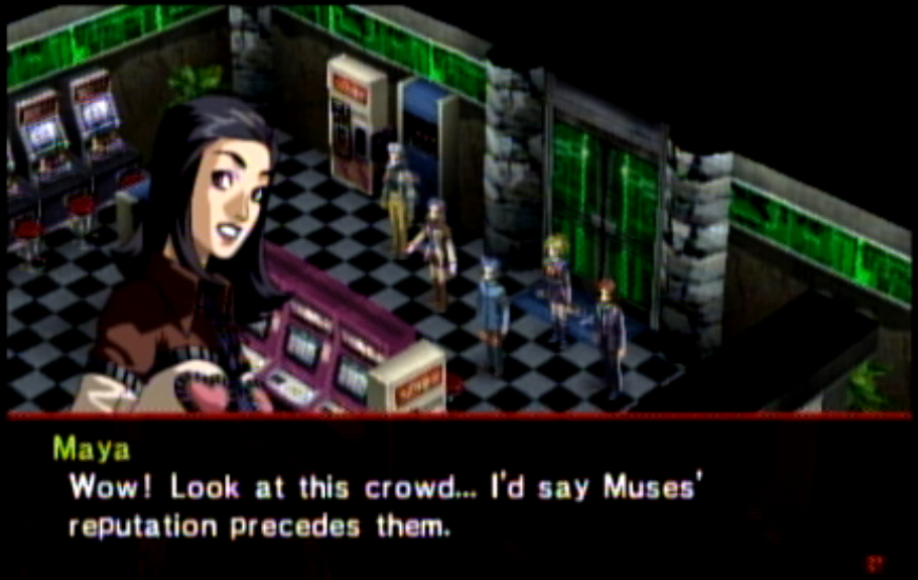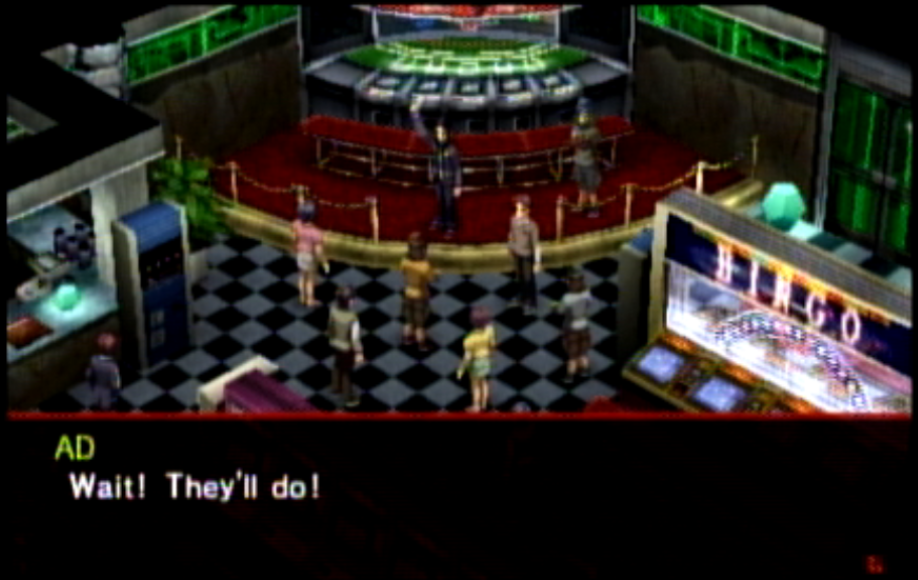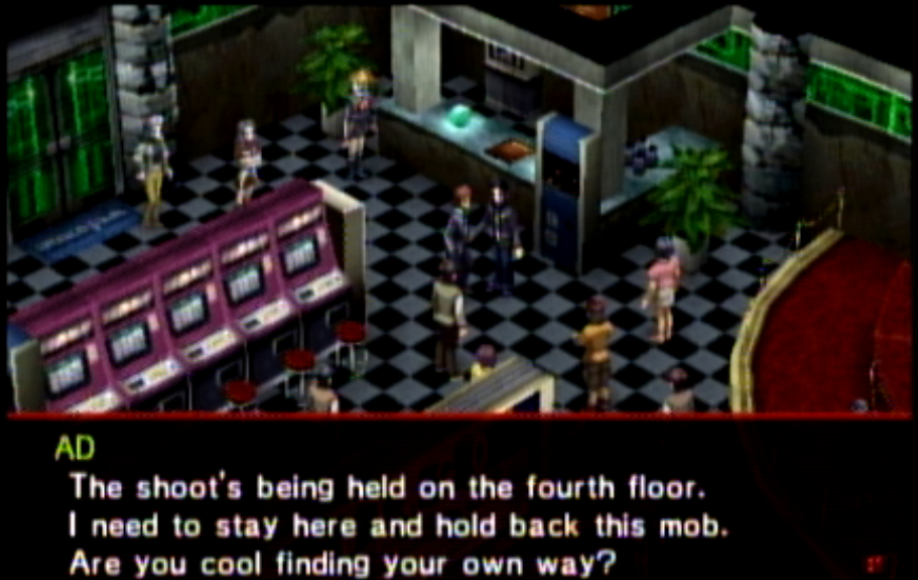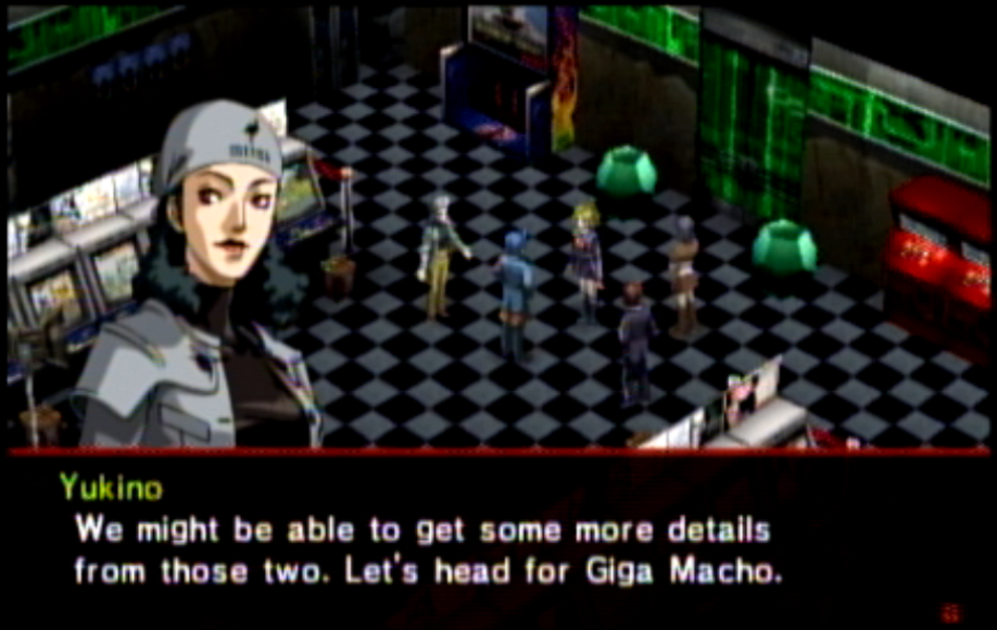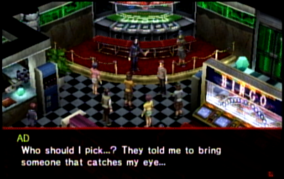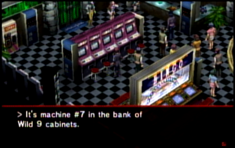 : I’ll probably spread the rumor about it eventually just to show it off, but the casino in Mu is very different from Judgement 1999 in Persona 1. The machines are numbered, and you can talk to people on the street to find out which machines are the easiest to win on. The only problem is that your win chance depends on Tatsuya’s luck stat, which is pretty low because we’re pumping Dexterity for fusion spell damage.