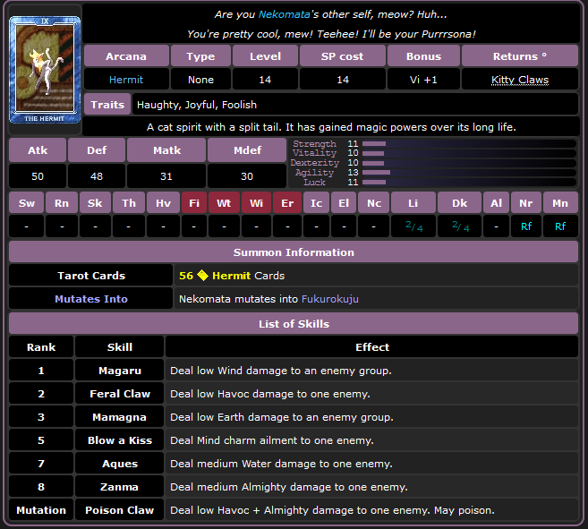 : Nekomata is a pretty average Persona, apart from the fact that she learns Zanma. As you can see, the Zan spell line (which did Blast-type damage in Persona 1) now does Almighty damage. This is as close to Megidolaon as we can get.