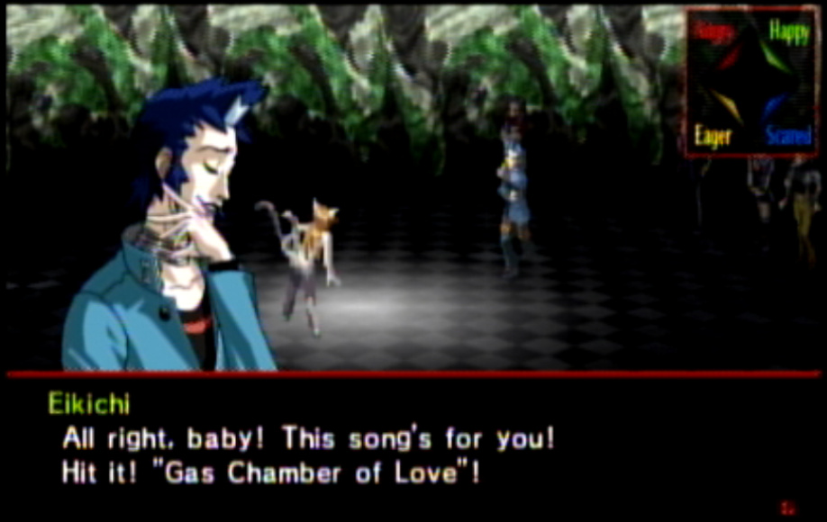 : Faust gave me just enough EXP to level Eikichi to 14. I really don’t understand why Eikichi is the source of like, 90% of all negotiations in this game. I think I’ve used Yukino all of once for that. This one in particular is annoying because Eikichi’s “sing” tactic has a roughly 10-second unskippable animation attached to it. Thankfully, we only need to do this to form the pact.