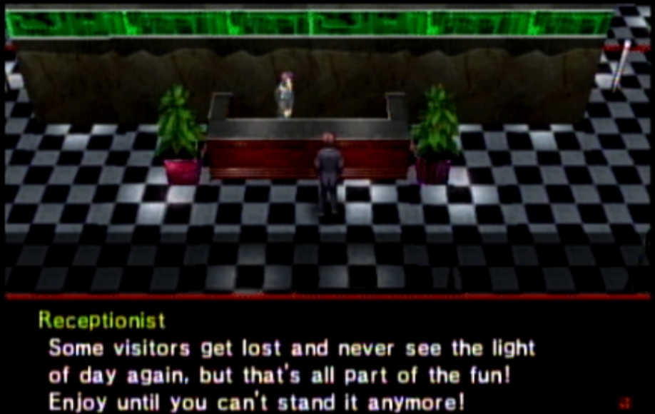 : Once we take the staircase further down on the second floor, we wind up behind a rope barrier a few feet from the reception desk in the front. Why they even have this up when the cast are trying to get through, I have no idea.