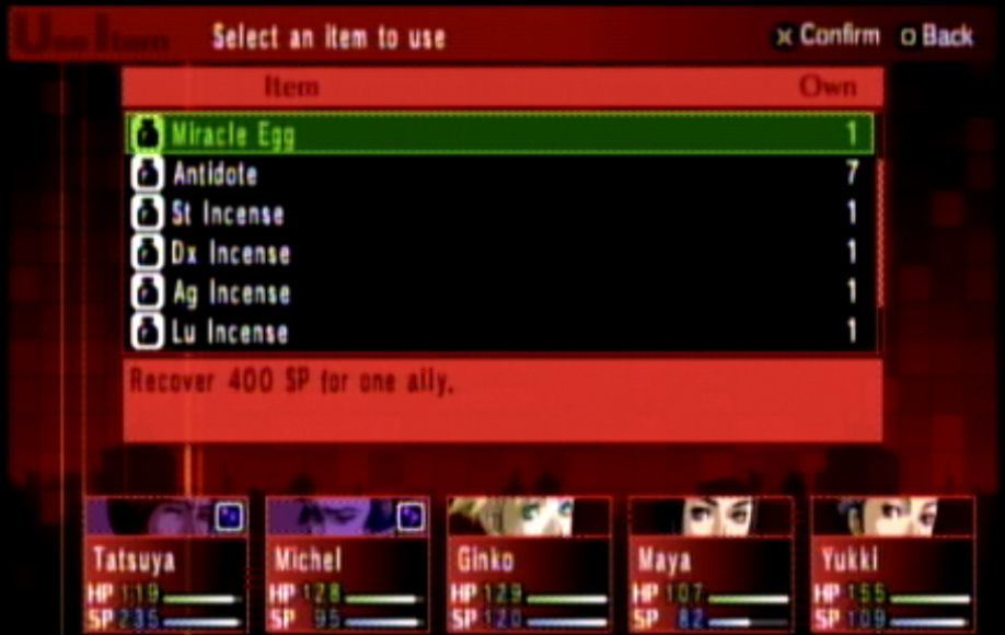 : Faust drops a Miracle Egg, which is complete overkill right now. I never mentioned it in the Persona 1 LP, but in both Persona 1 and the Persona 2 duology your party recovers SP as they walk. I don’t know why they left that feature out of the rest of the games.