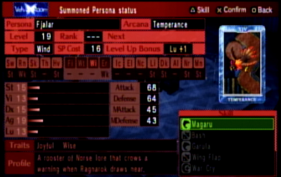 : What I had to change Maya’s Persona to is Fjalar here, not to be confused with Vidofnir. I don’t know how Norse mythology manages to have more than one magic rooster in it. We need Vidofnir for a fusion spell, and that’s about all we need him for.